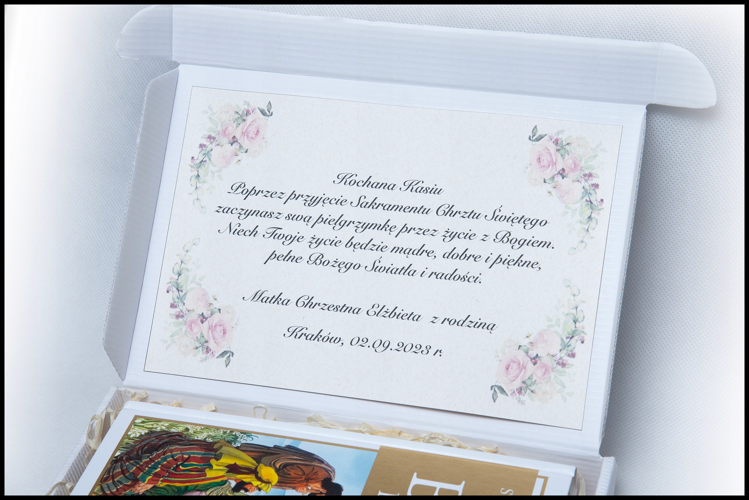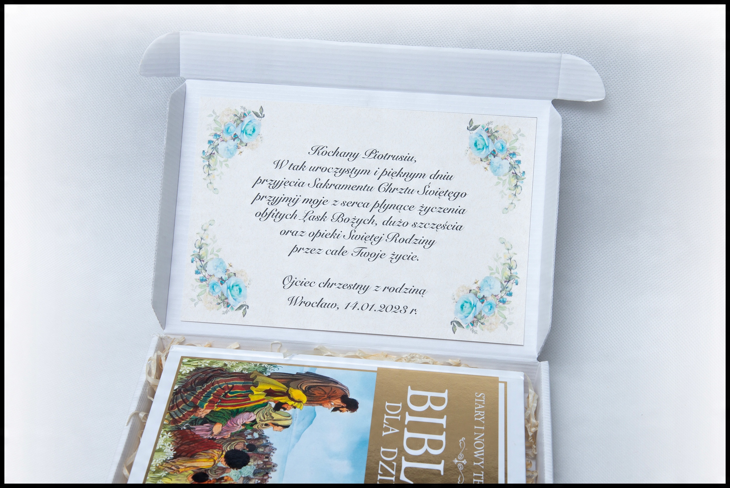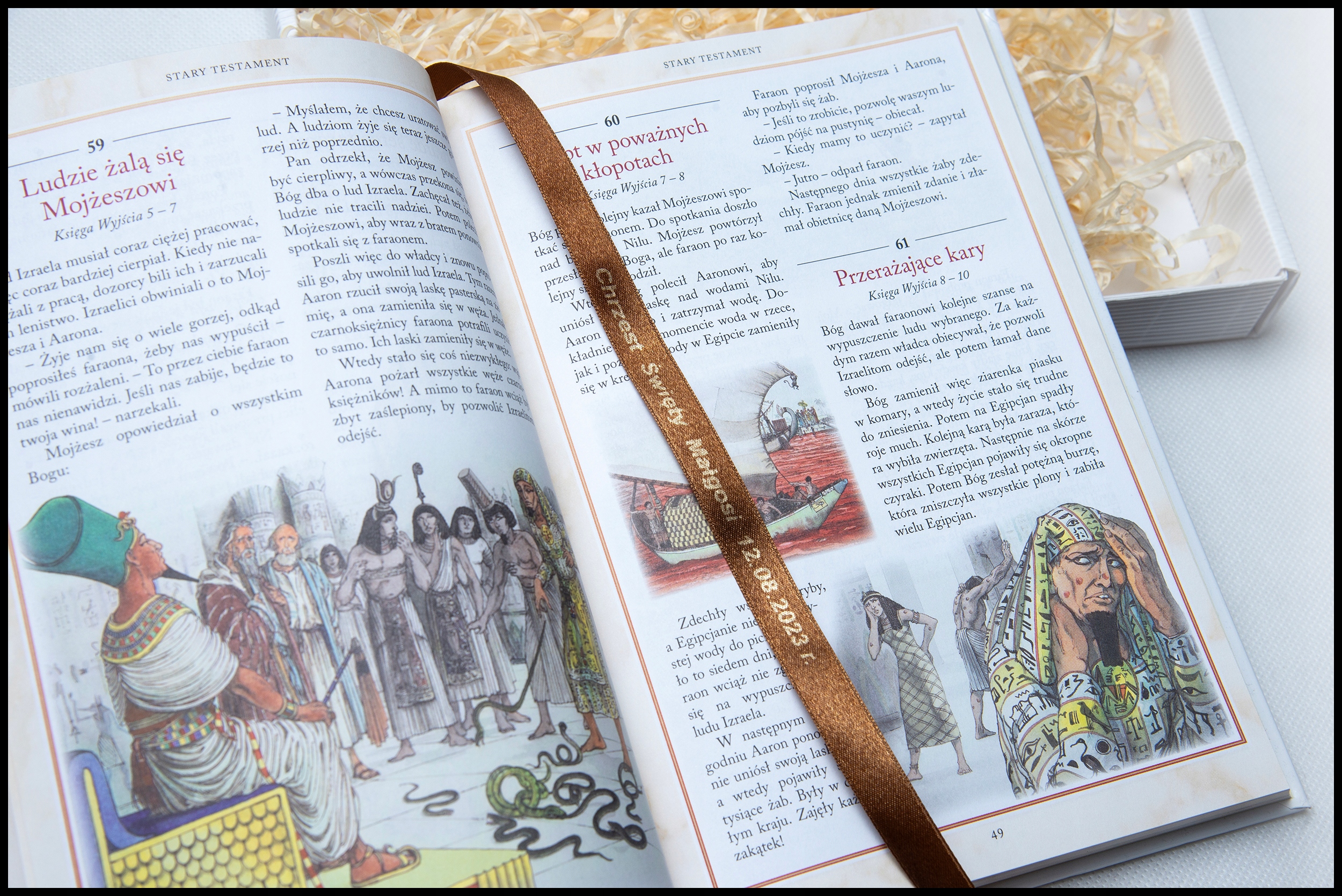 Внутри Библии имеется посвящение (несколько вариантов на выбор или ваше собственное предложение) и персональная закладка на на котором вы можете указать название и дату этого особенного дня.