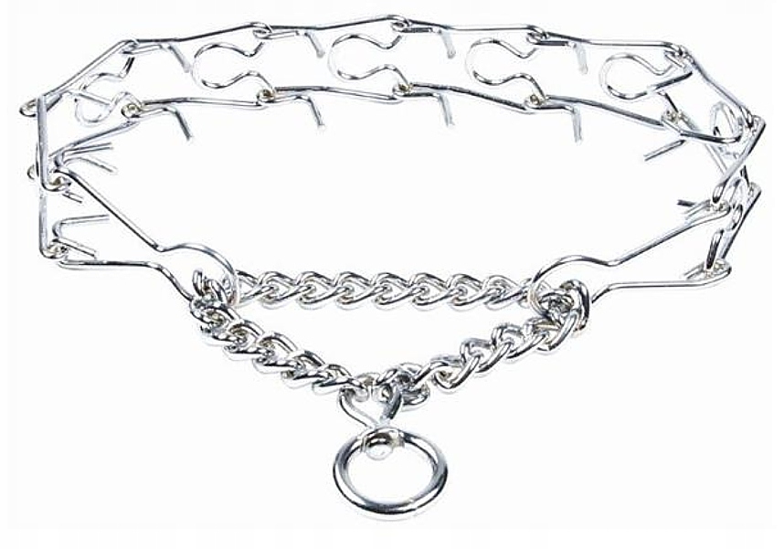 Популярный ошейник типа «шиповый ошейник», имеющий цепочную структуру, звенья которого заканчиваются выступающими тупыми концами проволоки.