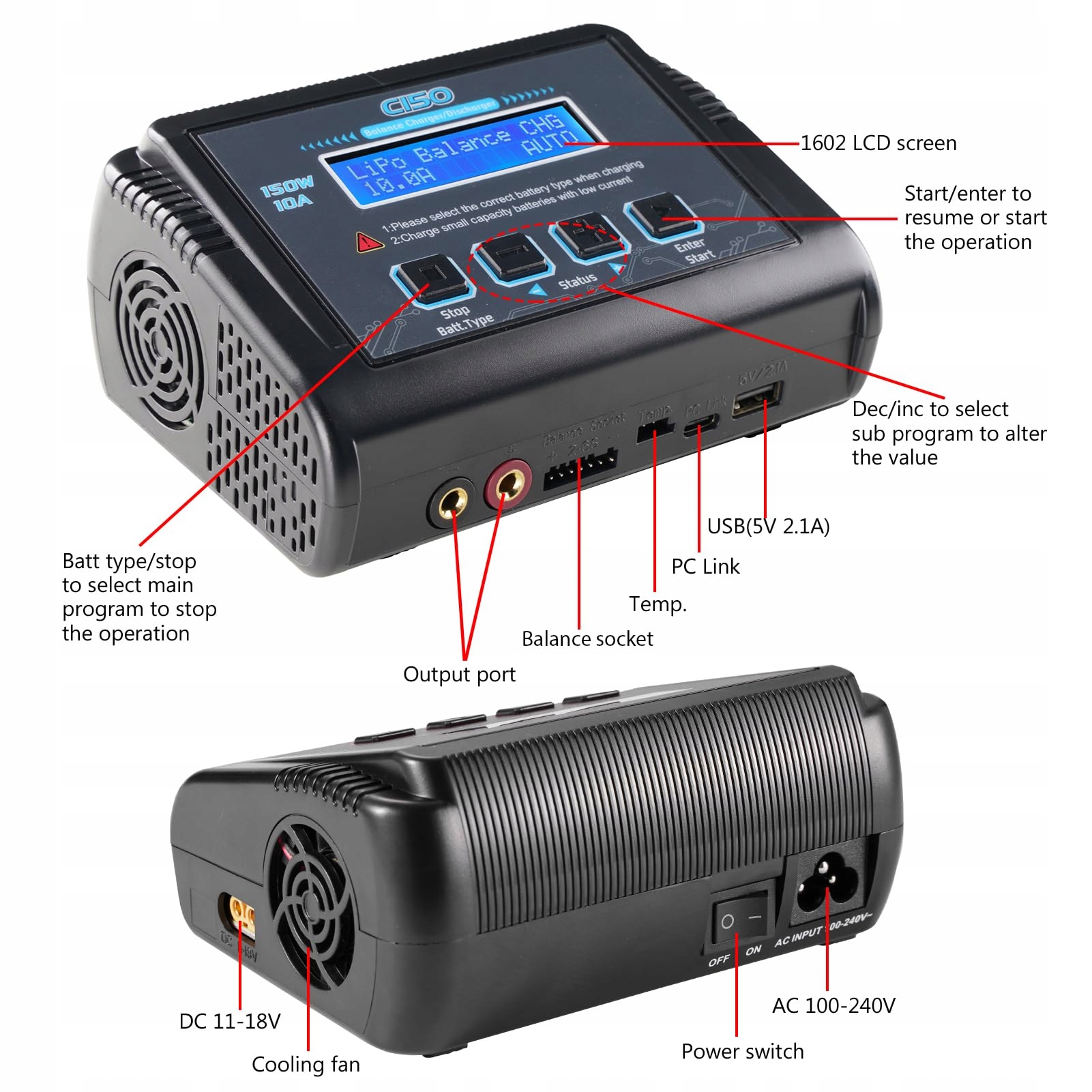 【Высокопроизводительное компактное зарядное устройство】 Двойной ток переменного тока, вход AC 100-240 V, вход DC 11-18 В, максимальная выходная мощность 150 Вт, ток зарядки 0,1-10 а, ток разгрузки 0,1-2 A. Встроенный вентилятор и источник питания. С сетевым переключателем. Портативное и быстрое зарядное устройство Lipo идеально подходит для различных батарей RC