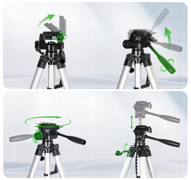 - [3-D-Drogowa Miss Head] Лазерный штатив Level предлагает 360-ступенчатую роторную панорамную вид, обеспечивающий горизонтальный и вертикально с любого угла. Движение головки штатива контролируется ручкой позиционирования и отдельной ручкой, которая позволяет иметь вертикальный уклон на 90 градусов.