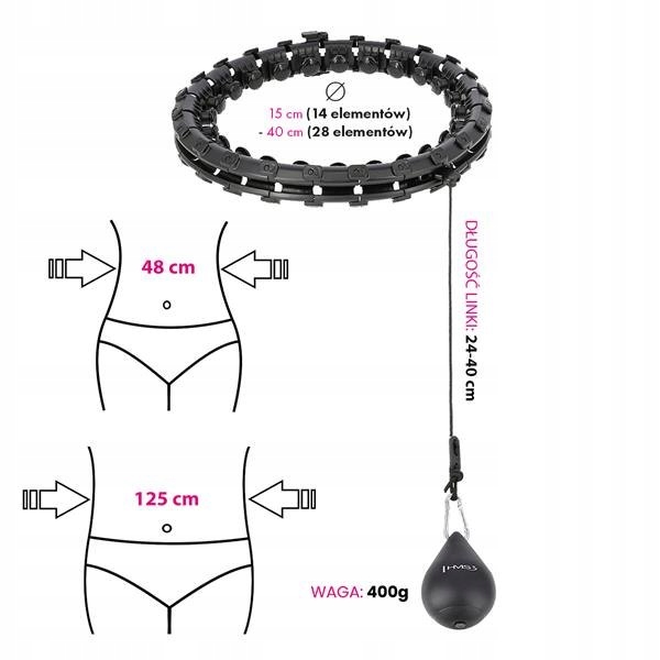 быстро и удобно уменьшить или увеличить размер колеса, просто удалите или подключите столько элементов, сколько вам нужно. HHW12 имеет в общей сложности 28 элементов. Размер может быть установлен в диапазоне от 14 до 28 элементов, то есть окружность талии от 48 см до 125 см (диаметр петли: от 26 см до 51 см). Благодаря этому устройство никогда не упадет во время обучения.