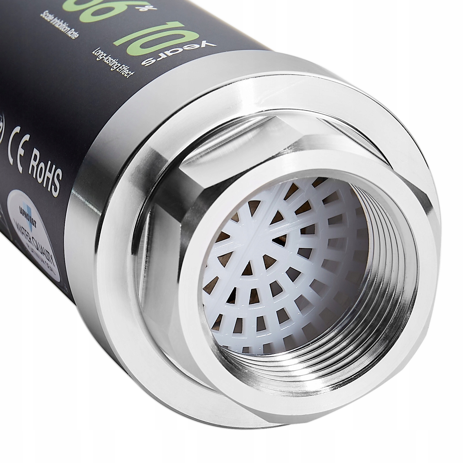 уменьшает осаждение камня: этот бессмысленный дизайнер, работающий для всего дома, использует поток воды, влияя на специальную физическую структуру внутри устройства. Он генерирует микроэлементы, которые активируют ионы кальция в воде, предотвращая кристаллизацию камня. Эффективность снижения составляет 86%.