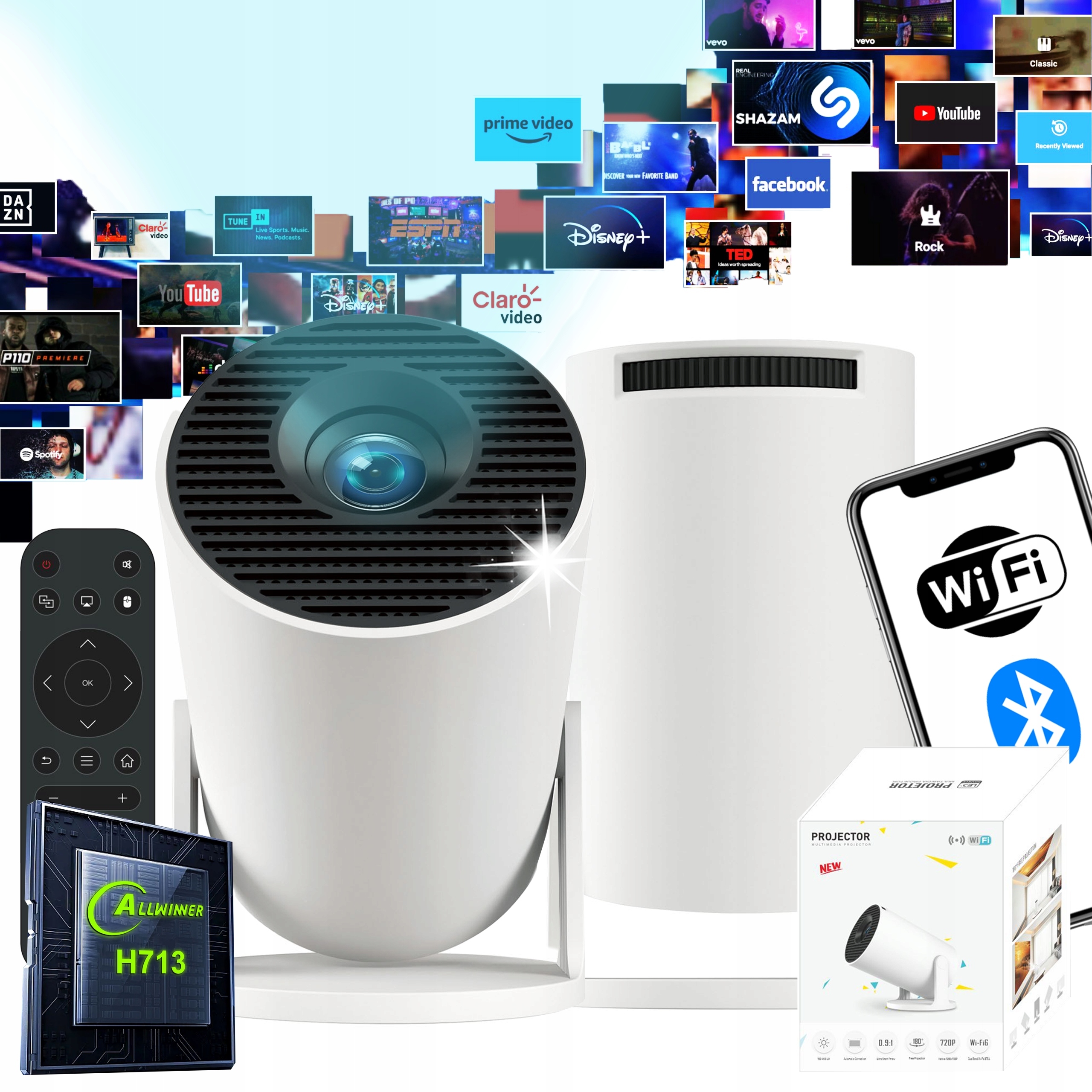- Более 4000 развлекательных приложений — проектор обеспечивает доступ к огромному количеству приложений, включая популярные платформы, такие как YouTube, Amazon Prime Video, Disney+, Claro Video, DAZN, Facebook, TED, Shazam и многие другие. другие.
