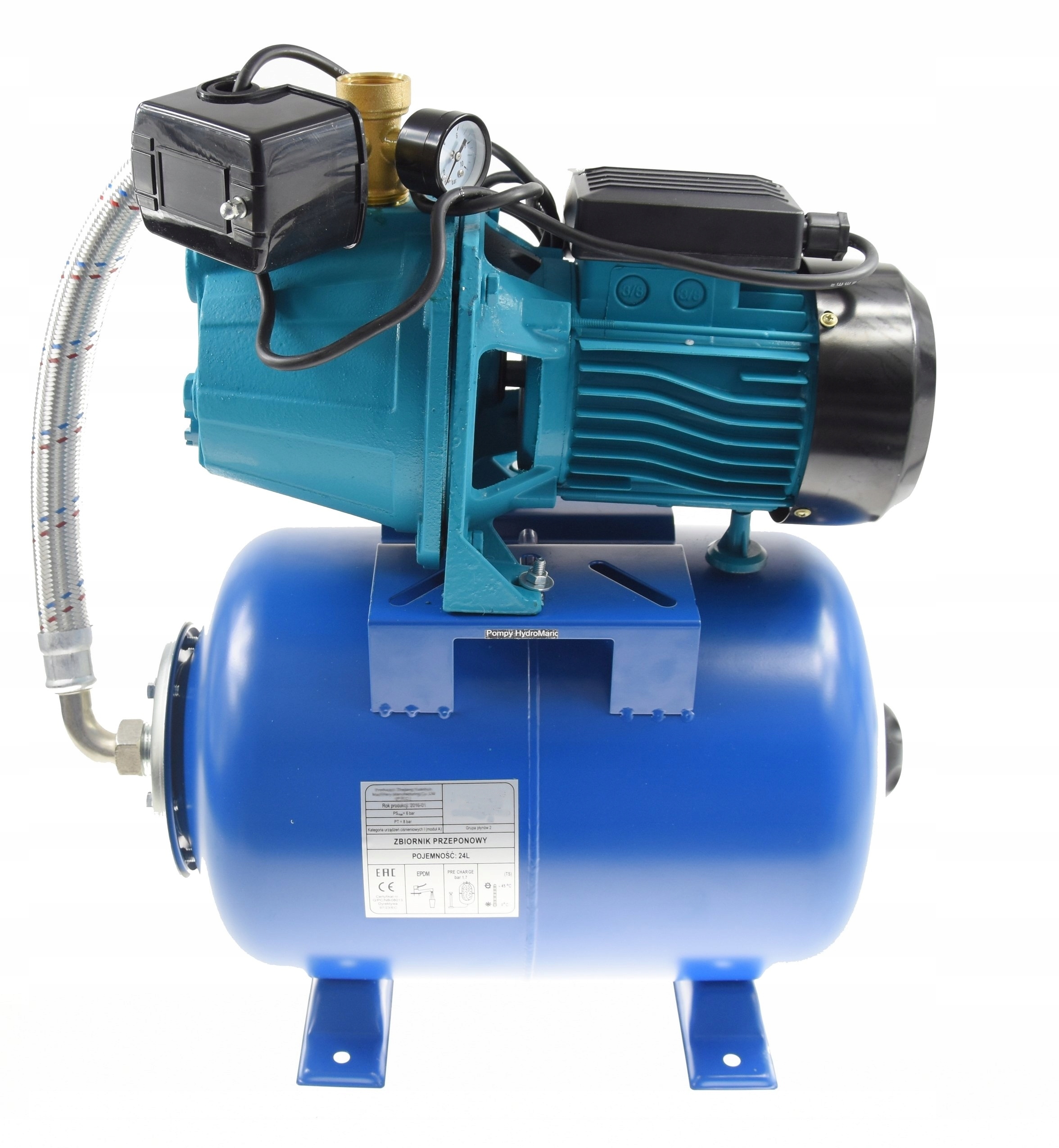 24L гидрофорный комплект, оснащенный насосом с аксессуарами. Благодаря универсальным параметрам он имеет широкий спектр применения, например, для снабжение домов b> одно- или многоквартирных домов, идеально подходит для дачи, приусадебных участков, полива с так называемые шланг или к небольшой ирригационной системе.