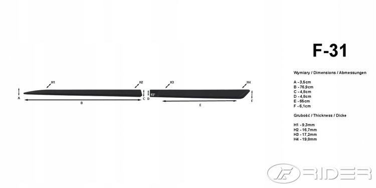 Боковые полосы автомобиля RIDER очень хорошо защищают двери автомобиля и их рельефы от потертостей и царапин, которые могут возникнуть при парковке в ограниченном пространстве. Полоски устанавливаются, не затрагивая кузов автомобиля. Монтаж осуществляется с помощью самоклеящейся ленты 3М, предварительно нанесенной на поверхность полос.