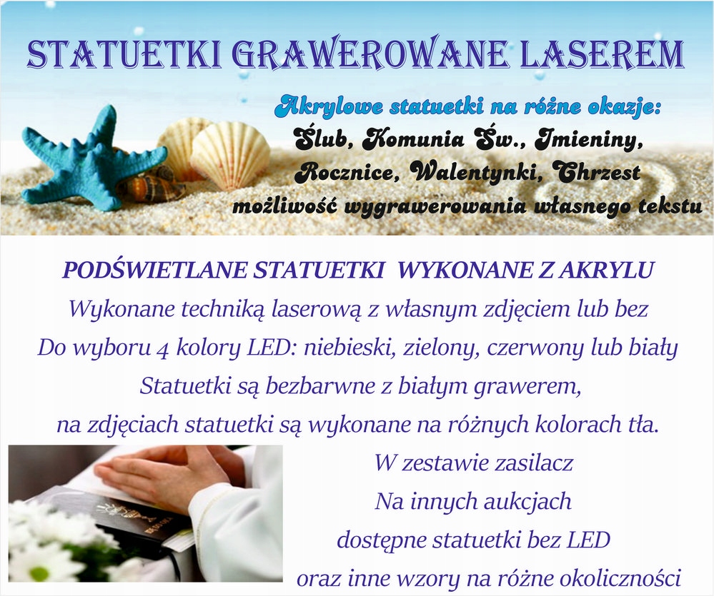 Просматривая «I KOMUNIA ŚWIĘTA PODŚWIETLANA STATUETKA Z FOTO LED», вы можете быть уверены, что данный товар из каталога «[rubrica_name]» будет доставлен из Польши и проверен на целостность. В цене товара, указанной на сайте, учтена доставка из Польши. Внимание!!! Товары для Евросоюза, согласно законодательству стран Евросоюза, могут отличаться упаковкой или наполнением.