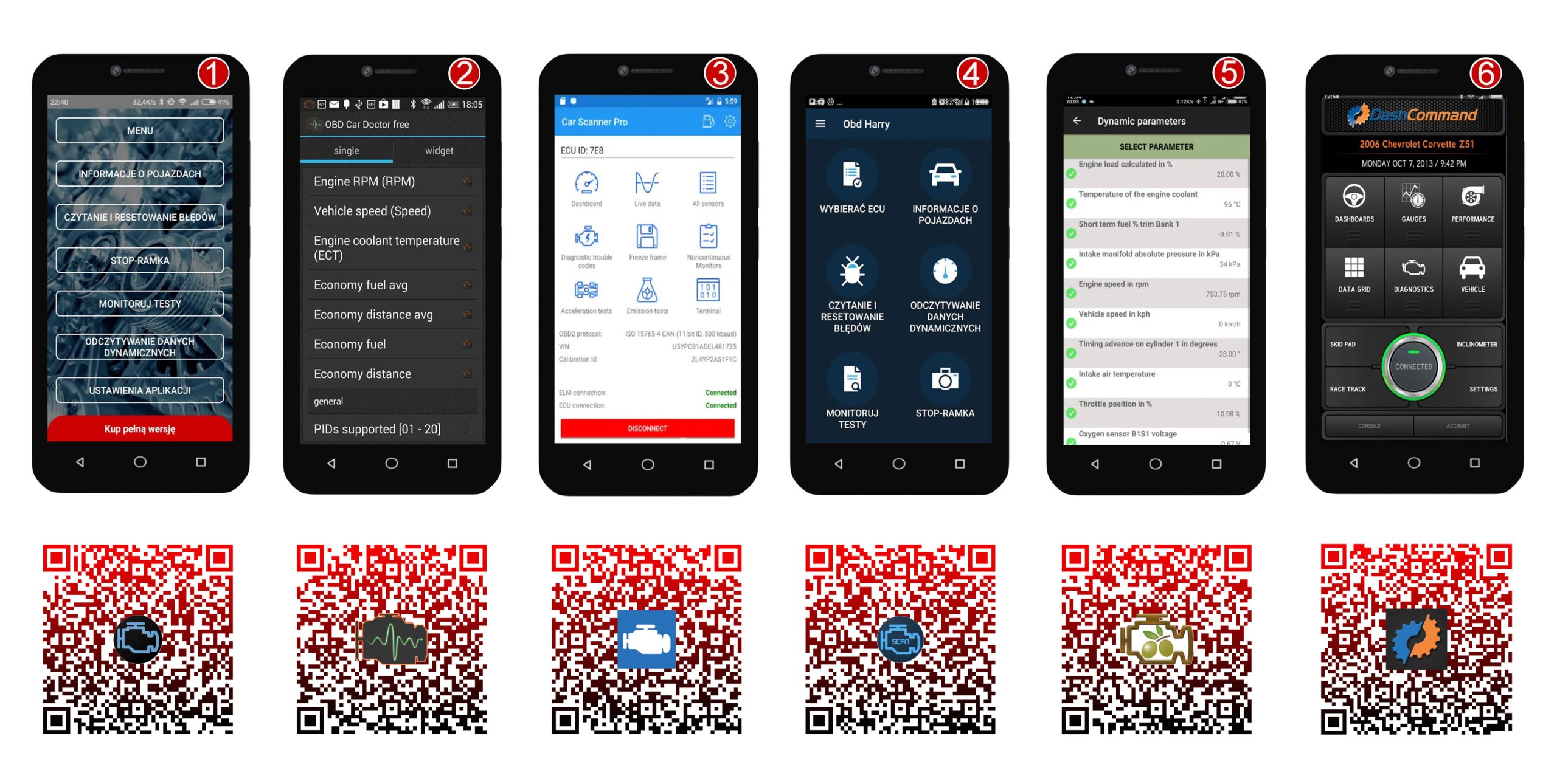 TORQUE - для ANDROID SYMBIAN WINDOWS MOBILE, PCMSCAN, Maxitest, MAXIECU, ScanXL-ELM, DashCommand-ELM, GM Mode 22 Scan Tool от Терри, OBD Gauge для PalmOS и Pocket PC от Даны Питерс, OBD Logger от Джонатана Сенкерика, OBD-II ScanMaster от Владимира Гурского, obd2crazy.com, ScanTool.net, OBD Gauge для Palm OS, ScanTest для Pocket PC, ScanMaster-ELM, ScanXL, FiatEcuScan, MultiEcuScan, OPELtestPL,SDPROG PL и т. д.