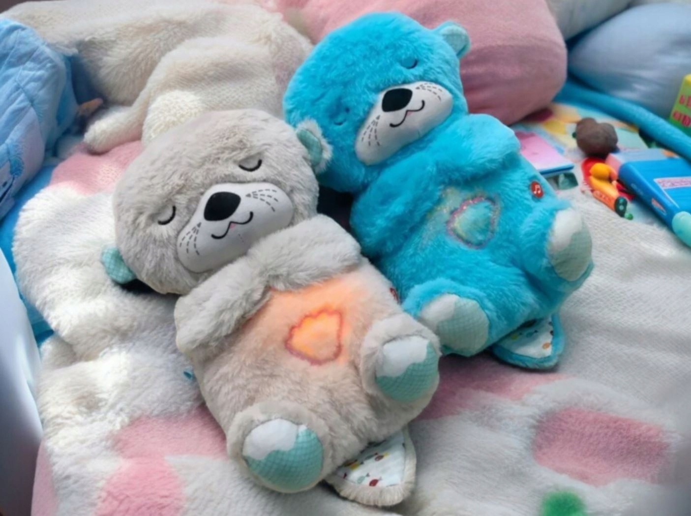 - Выдра «дышит» — мягкий живот ритмично поднимается и опускается, как при дыхании, что естественным образом успокаивает малыша.