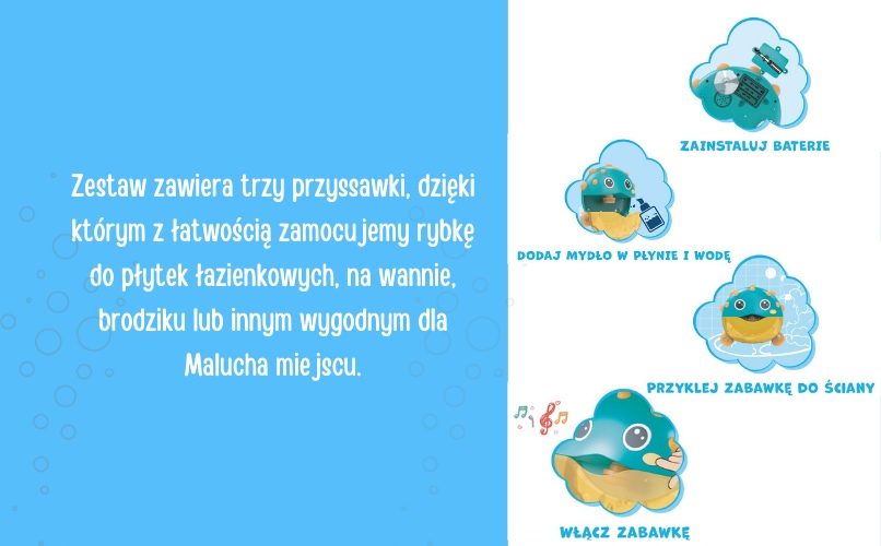 - В комплект входят три присоски, благодаря которым мы легко прикрепим рыбку. на плитку в ванной или на ванну, детский бассейн или другое удобное для малыша место.