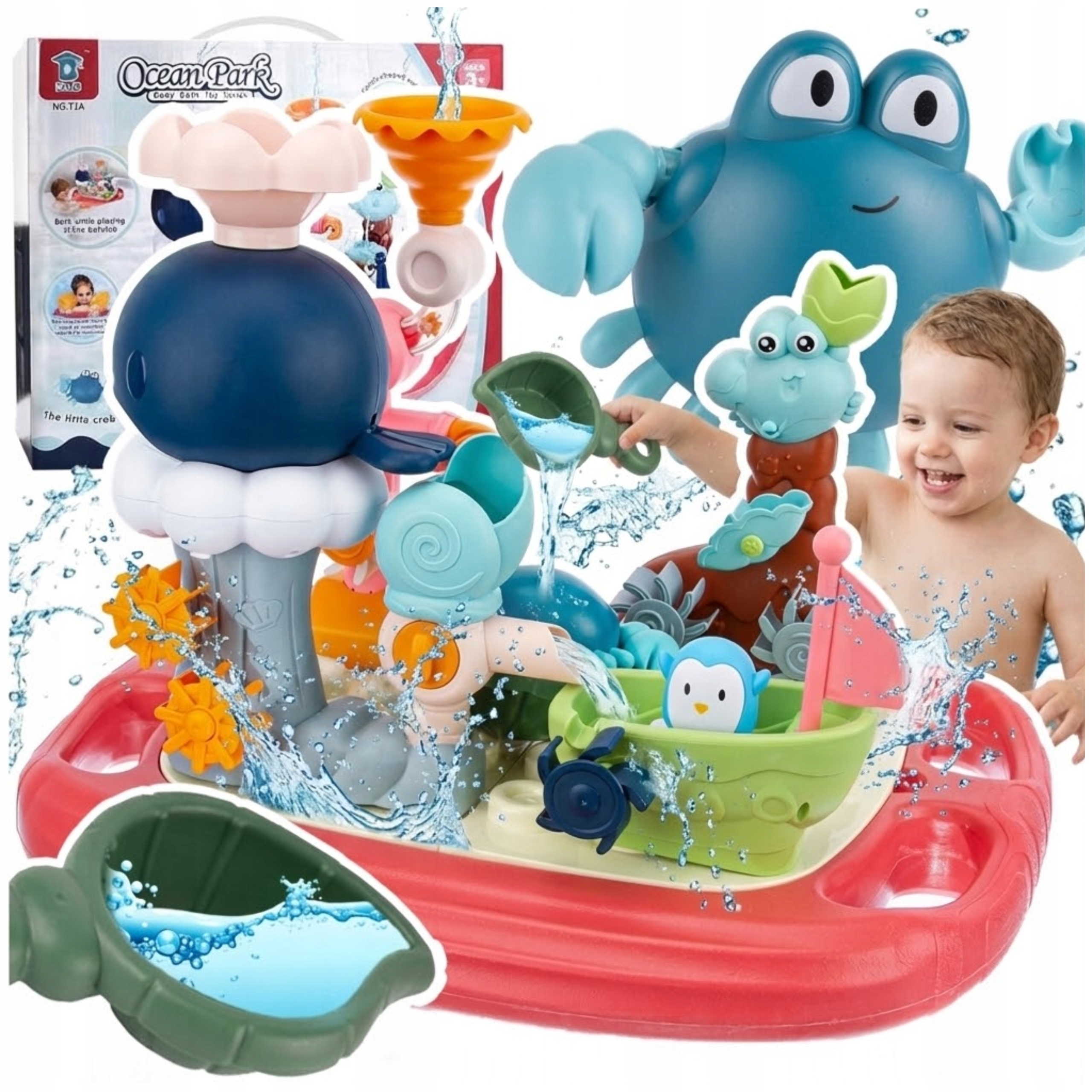 Представляем уникальный, большой набор для ванны, который превратит любую ванну или садовый бассейн в настоящий аквапарк! Эта креативная игрушка состоит из плавучей платформы и множества подвижных вращающихся элементов, которые активируются под воздействием воды. Наливая воду в башни, ребенок начинает вращать турбины и наблюдает эффект водопада, одновременно изучая причинно-следственные связи. Самое главное, что после разбора игрушек на большой доске можно научиться плавать!» Это идеальный подарок на любой случай, доставляющий радость от купания.