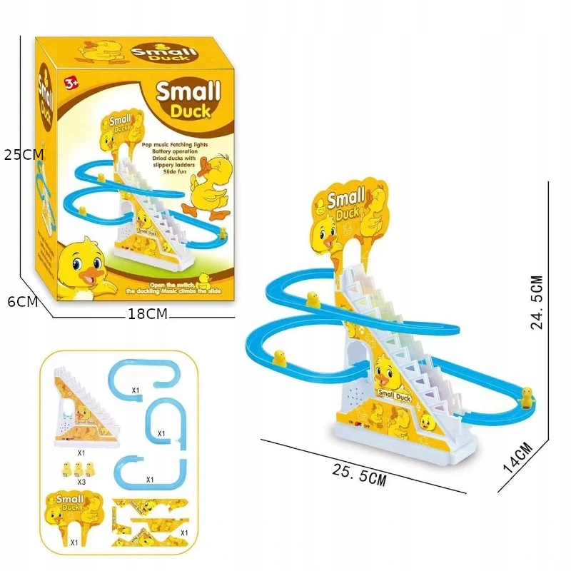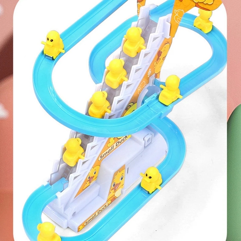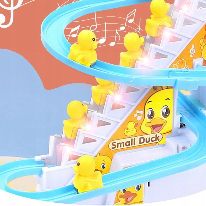 В этот набор игрушек входит очаровательная желтая утка с мигающими светодиодными лампочками, которая может подниматься и спускаться по лестнице.