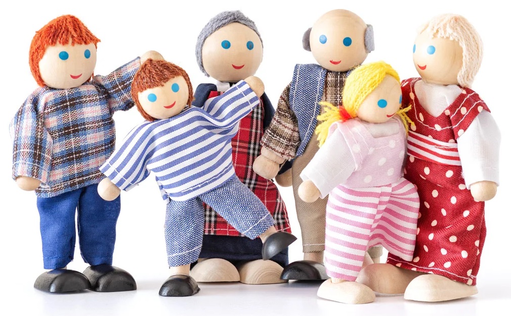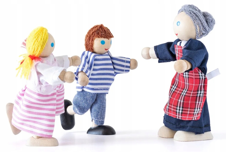 Деревянные куклы, одетые в тканевую одежду. Ноги и руки кукол изготовлены из закаленной веревки, которая сохраняет угол изгиба при сгибании без особых усилий. Большая семья из 3-х поколений станет отличным развлечением для самых маленьких!