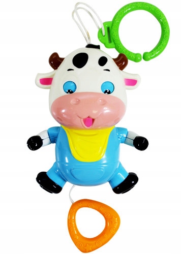 Потянув за удобную звездообразную ручку, мы активируем музыкальную шкатулку, из которой будет звучать красивая мелодия и при этом корова весело будет шевелить своей лапки и глазки, которыми я буду привлекать внимание ребенка. Также игрушка имеет круглую ручку, позволяющую прикрепить ее к кровати, коляске или любому другому месту.