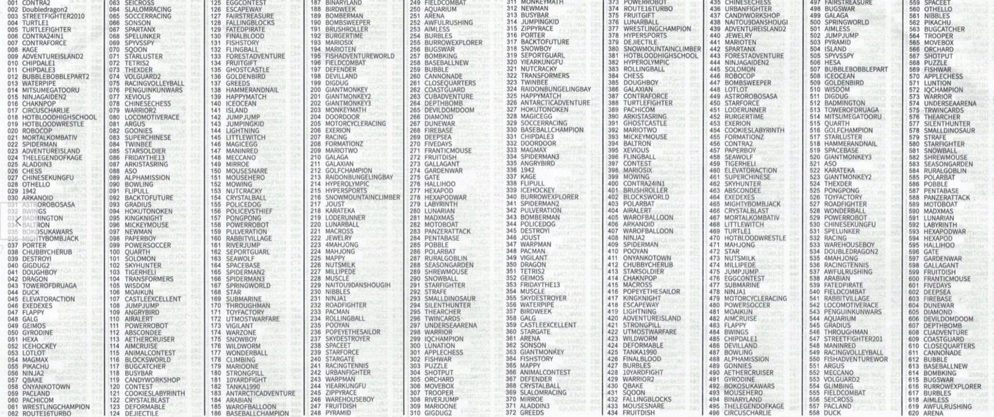 Самые известные игры, такие как Mario, Sonic, Contra, Tank, Bomber Man, Donkey Kong и сотни других.