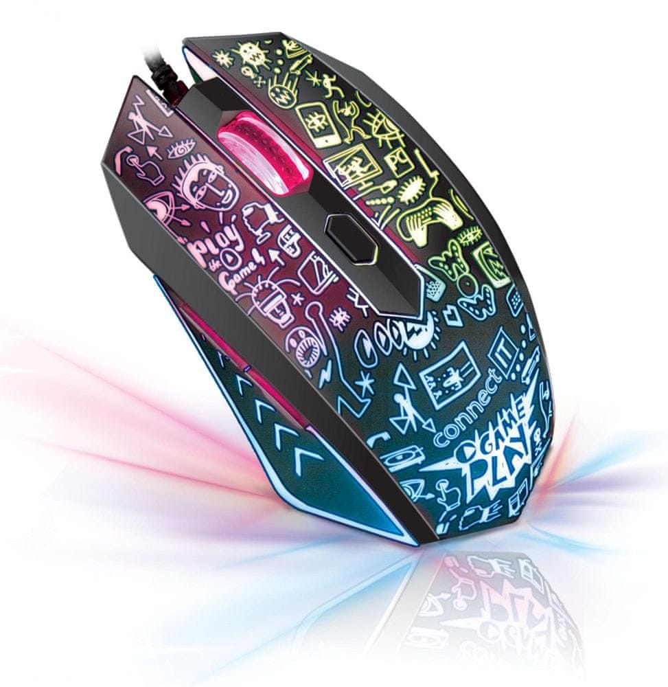 Мышь Connect IT CI-1143 Doodle с первого взгляда порадует своим оригинальным дизайном. Его поверхность украшена множеством мелких креативных рисунков, а стильный внешний вид подчеркивает впечатляющая многоцветная светодиодная подсветка.