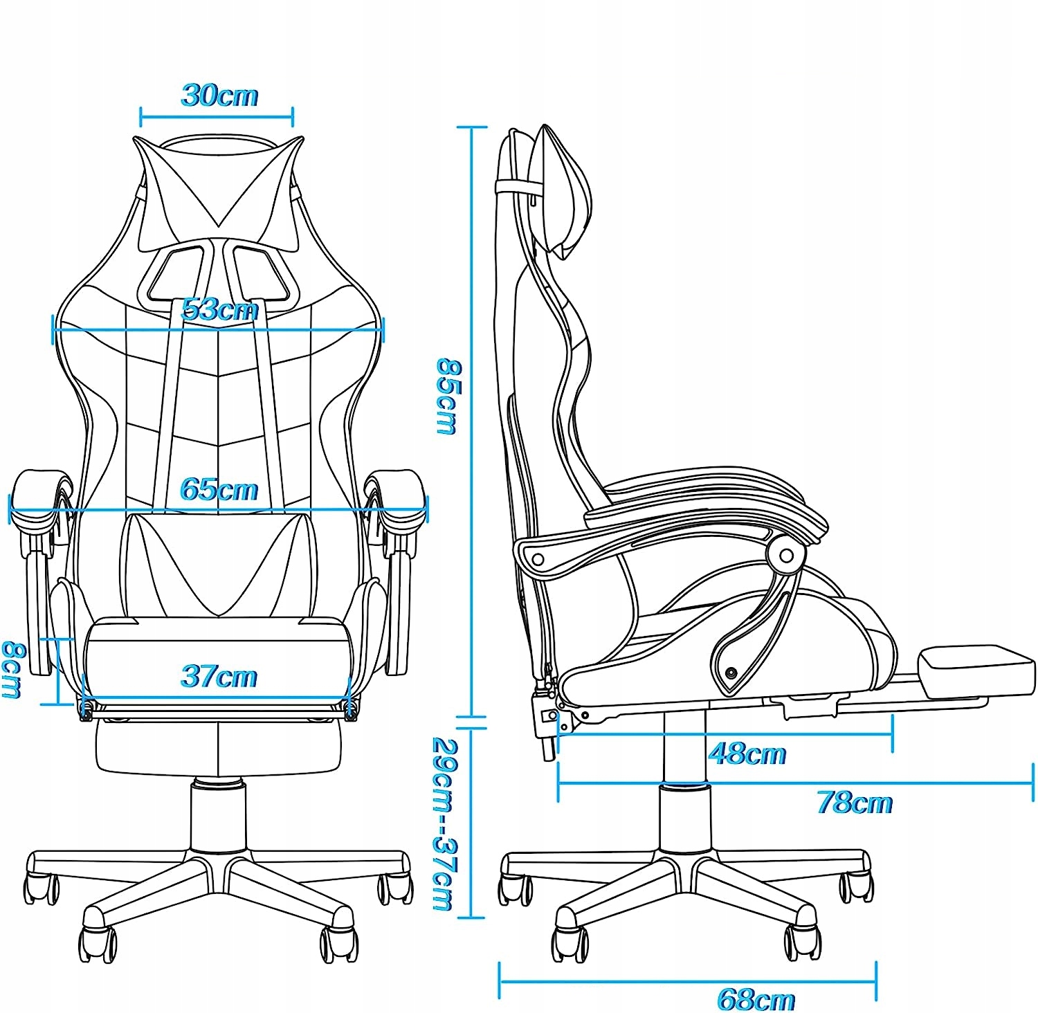 Сиденье этого высококачественного кожаного игрового кресла изготовлено из пены с эффектом памяти толщиной 9 см и не разрушается после длительного сидения. Кроме того, сиденье можно регулировать вверх и вниз на 10 см, прочный корпус делает гоночное кресло более безопасным.