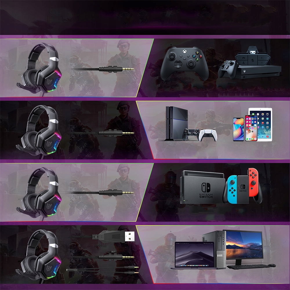 благодаря разъемам, в которых была оборудована гарнитура Onikuma, она характеризуется универсальной универсальностью. Высокая совместимость между платформой означает, что вам больше не нужны разные наушники, адаптированные к оборудованию, которое вы в настоящее время играете. Продукты Onikuma предоставит вам развлечения независимо от того, играете ли вы на своем компьютере, вы заядлая консоль или хотите использовать их на мобильных платформах. Если ваше оборудование поддерживает передачу звуков через порт Mini Jack, наушники Onikuma - отличный выбор для вас.