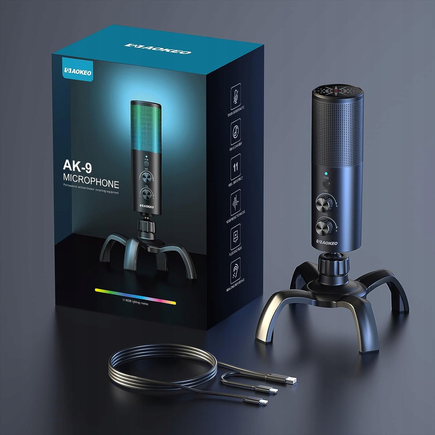 Игровой USB-микрофон Aokeo, конденсаторный микрофон с усилителем для ПК, RGB-подсветка для записи, подкастов, потоковой передачи, YouTube, Twitch, Skype, совместимость с ноутбуком PS5 PS4 Mac (черный)
