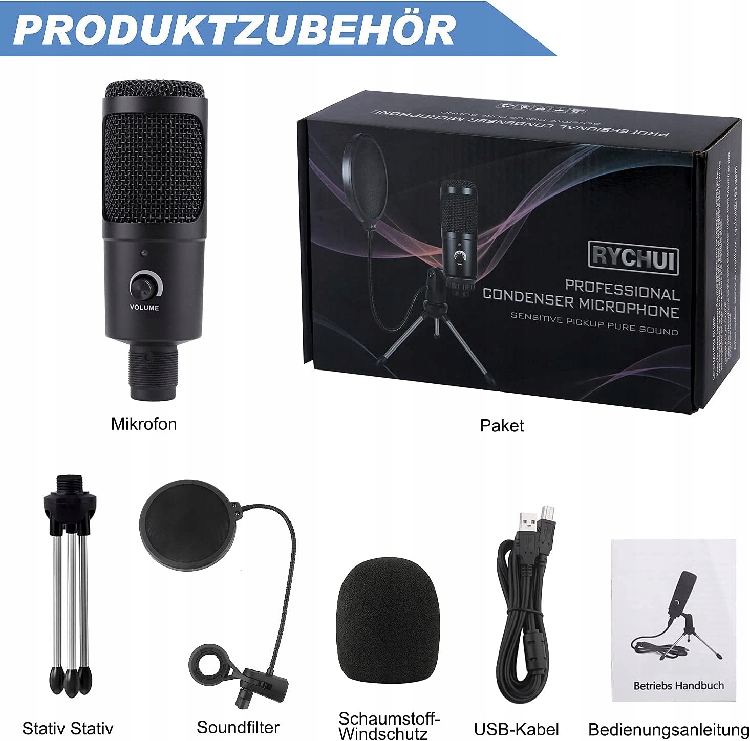 - Этот набор товаров: 1 микрофон, 1 складная подставка, 1 передняя крышка из пенопласта, 1 противообдувочная система, 1 USB-разъем и 1 руководство пользователя. Чтобы обеспечить работоспособность вашего компьютера с микрофоном, прочтите руководство пользователя и настройте USB-микрофон перед первым использованием.