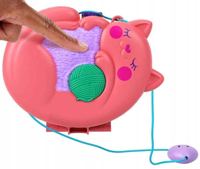 - Компактный набор Polly Pocket Purse Kitty имеет форму очаровательного котенка с мягким животиком, а также включает в себя микрокуклы Шани и ее подругу.