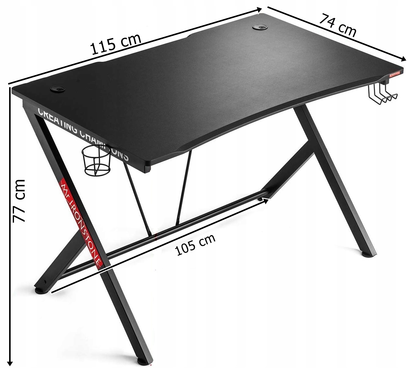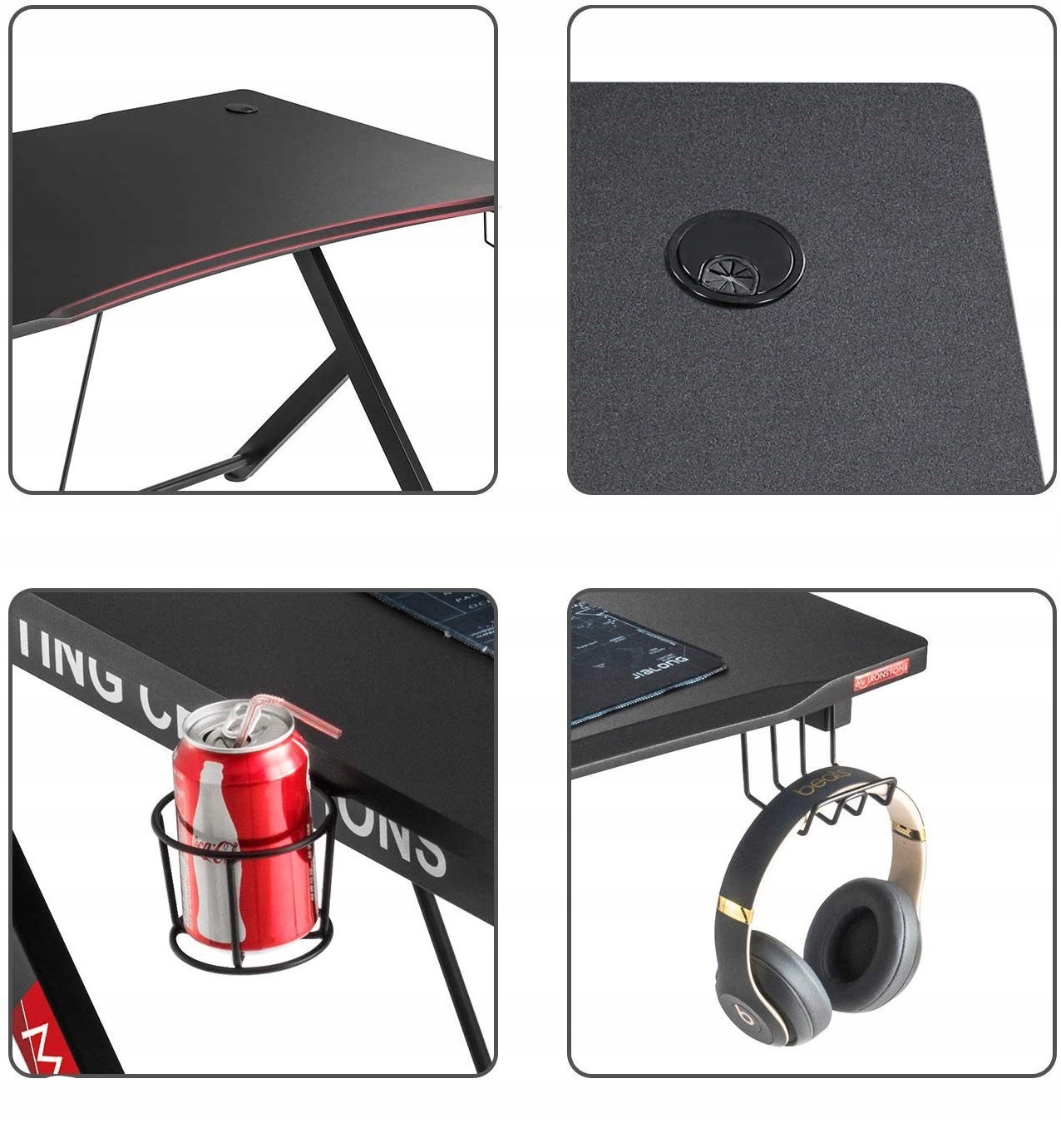 Стол имеет столешницу толщиной 8 мм, выполненную из прочного черного МДФ, а также имеет функциональные ручки, по бокам для напитков и наушников.