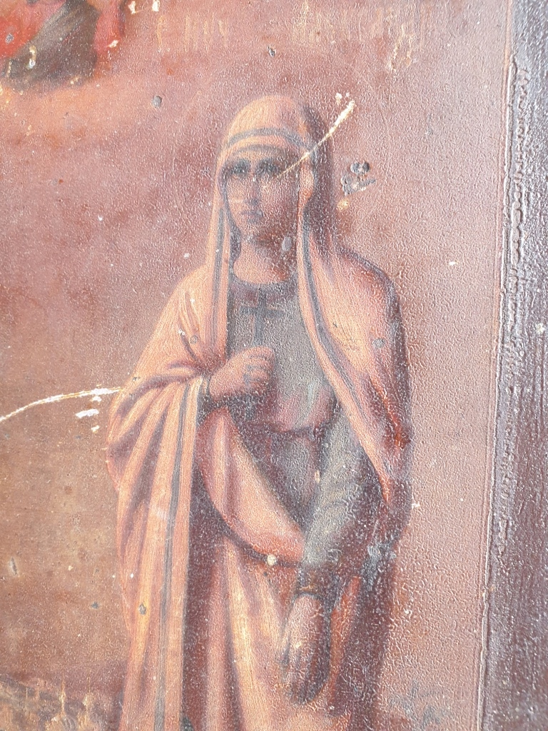 У МЕНЯ ЕСТЬ РУССКАЯ ИКОНА НА ПРОДАЖУ. ВОЗРАСТ ИКОНЫ БЫЛ ОЦЕНЕН НА РУБЕНЕ XVIII И XIX ВЕКА. ЗНАЧОК ВИДИМ НА ФОТО. СДЕЛАНО НА ДОСКЕ С МАТЕРИАЛЬНЫМ ПОКРЫТИЕМ. НА ЗНАЧКЕ ЕСТЬ НЕБОЛЬШИЕ ЦАРАПИНЫ И ПОВРЕЖДЕНИЯ, КАК ПОКАЗАНО НА РИСУНКЕ. ИКОНА В ХОРОШЕМ СОСТОЯНИИ, НЕ РЕМОНТИРОВАНА. У МЕНЯ ЕСТЬ ЕЩЁ ОДНА ЗНАЧКА НА ДРУГОМ АУКЦИОНЕ. Я НЕ ИКОНА ОПЫТА, ПОЭТОМУ СОСТОЯНИЕ И ВОЗРАСТ ДОСТАВЛЯЮ СПЕЦИАЛИСТАМ.