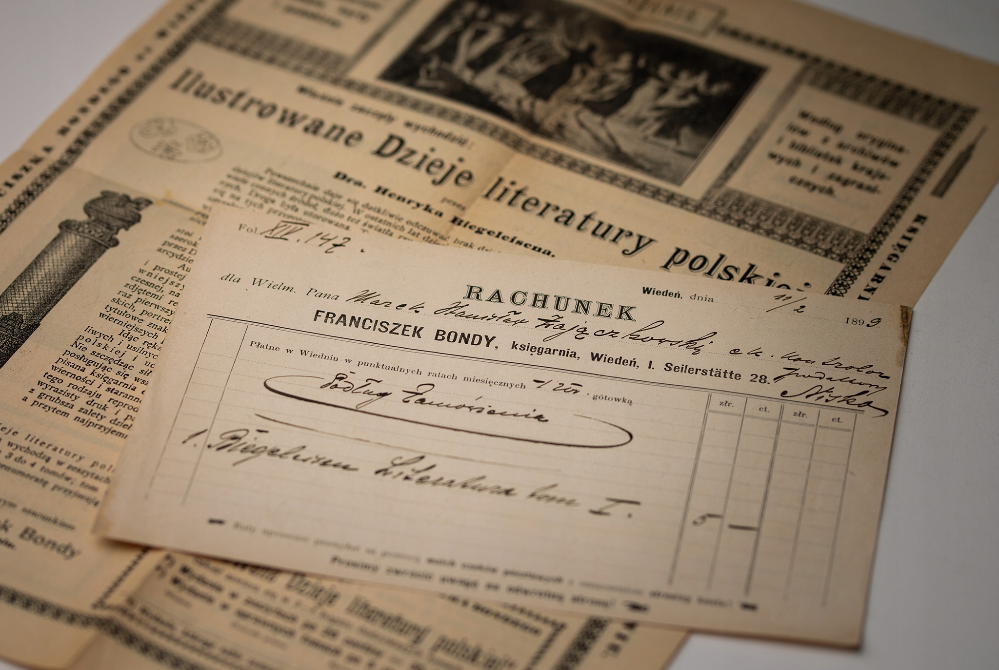 ILUSTROWANE DZIEJE LITERATURY POLSKIEJ, 4 TOMY z dokumentem zakupu z 1899 r