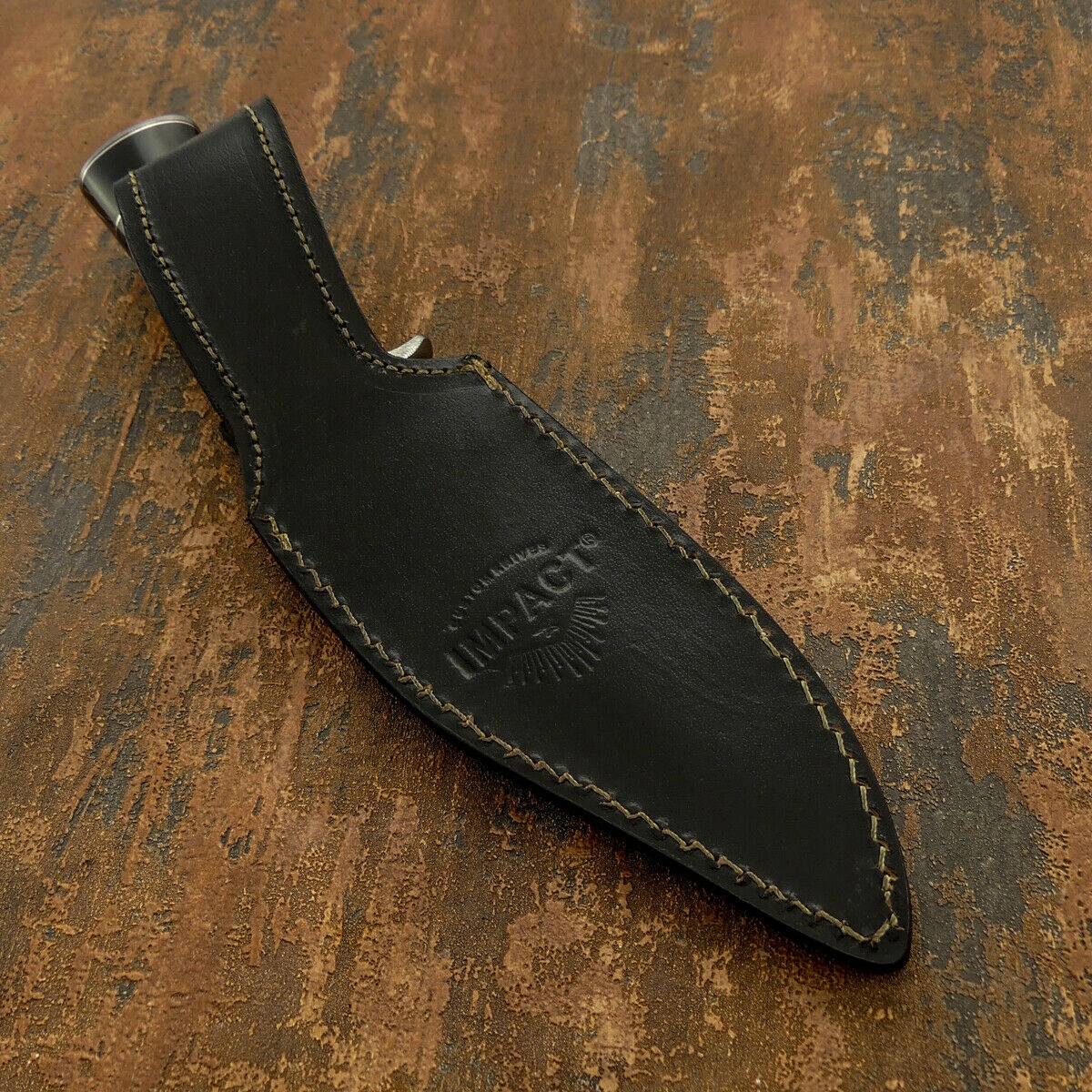 Ножны: прошитая плотная телячья кожа, вставка из кожи крупной экзотической ящерицы, клепаный, подписанный брендом Impact,