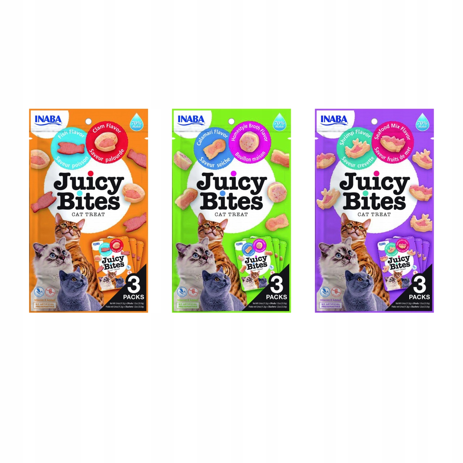 Juicy Bites — это влажные, мягкие, неотразимые лакомства из тунца и курицы, ароматизированные натуральными ароматизаторами, экстрактом зеленого чая и витамином Е. В каждой упаковке содержится 3 отдельные упаковки лакомств для сохранения максимальной свежести, причем в каждой из них содержится лакомство по две штуки. забавные формы и вкусы понравятся всем кошкам.