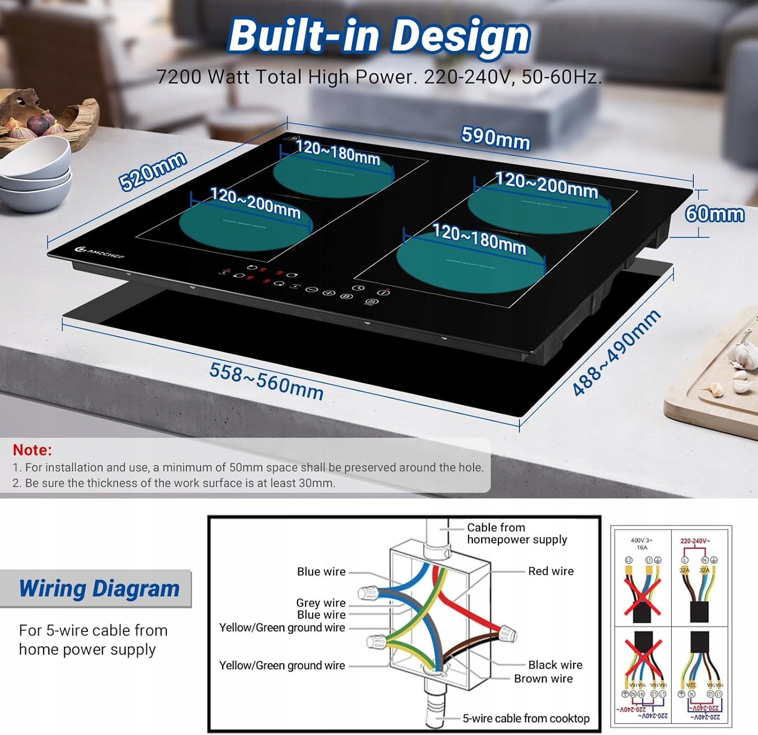 AMZCHEF Индукционная варочная панель 4 зоны, 7200Вт, с гибкими зонами