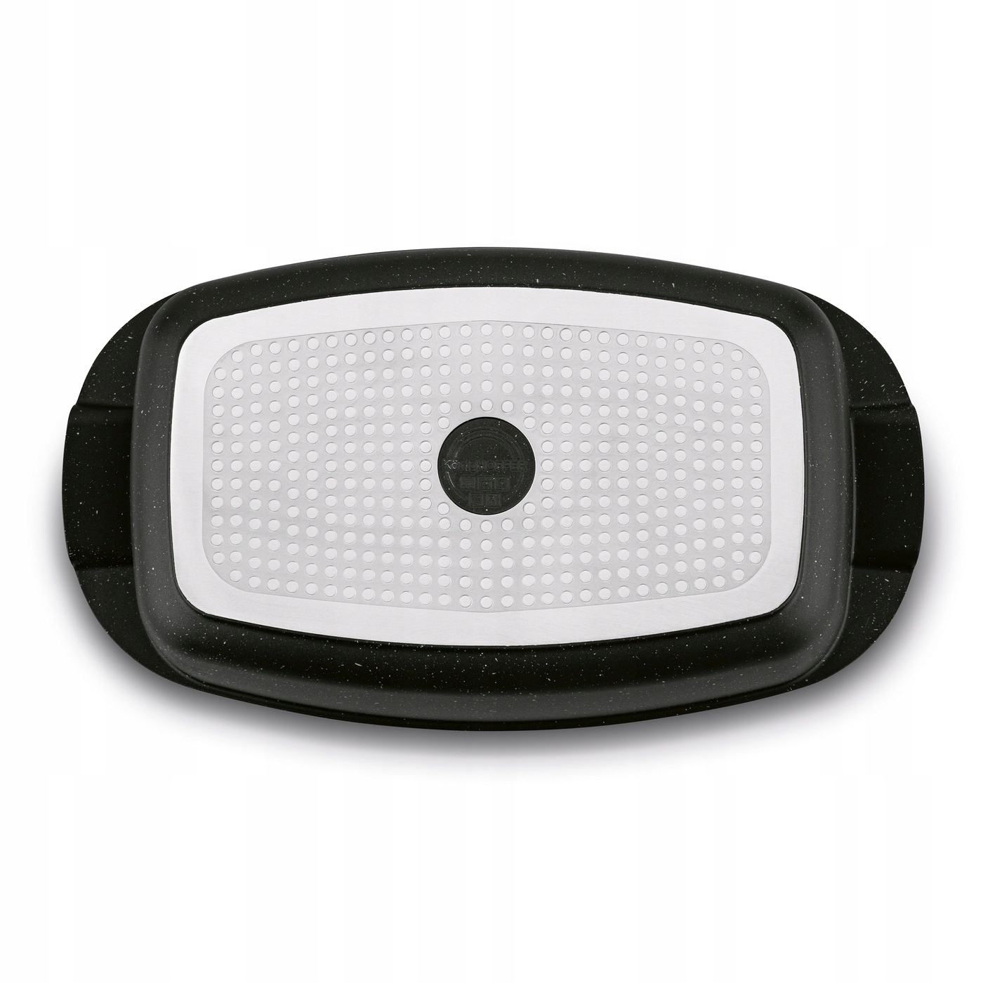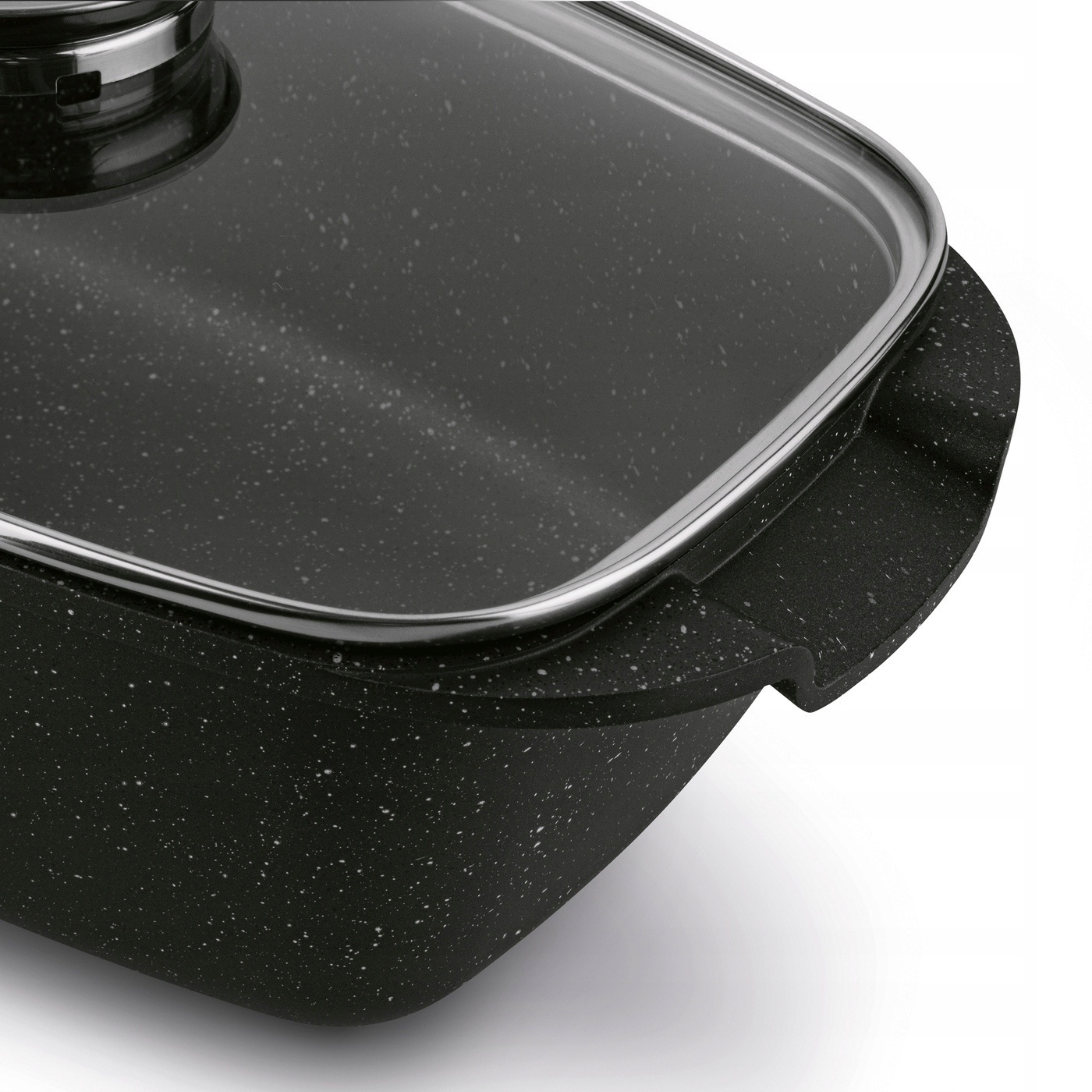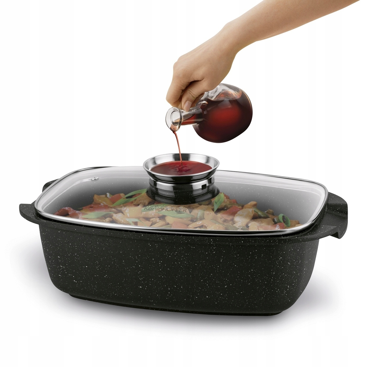 Прямоугольная жаровня Konighoffer Fegato (объемом 5,6 л) обеспечит вам высокий уровень комфорта во время приготовления пищи. Он защитит ингредиенты от пригорания и прилипания. Его внутренняя часть покрыта антипригарным покрытием GREBLON C3 от немецкого бренда WEILBURGER и обогащена гранитной пылью. Он будет нагреваться равномерно и быстро. Это позволит эффективно тушить под крышкой и постоянно контролировать процесс приготовления блюда. Вы получаете многолетнюю долговечность благодаря литому под давлением алюминиевому корпусу и каменно-мраморному покрытию без ПФОК, устойчивому к 8000 циклам истирания. Это вариант для всех, кто ценит здоровую и питательную диету, например, приготовленную с минимальным количеством жиров. Беспроблемный уход и долгий срок службы посуды из мрамора – другие основные преимущества приобретения этой модели энергосберегающей жаровни, имитирующей рисунок гранита. Вы можете использовать его на всех типах плит. Товар продается в наборе со стеклянной крышкой, оснащенной ароматизатором. Его можно использовать в духовке при максимальной температуре. 200 градусов С, но без крышки.