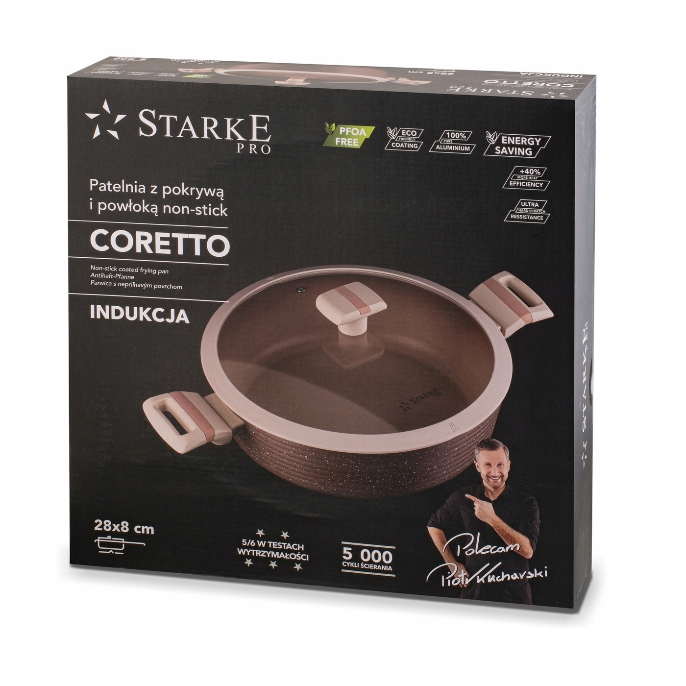 Несполенная индукционная кастрюля с крышкой и короткими ручками Starke Pro Coretto 28 x 8 см -алюминий, имеет толстые стены и защищает пищу от прилипания. Тип тела, который он использует, был вырезан из одного металлического листа с кованой техникой. Благодаря этому плитка очень твердый и хорошо проходит тепло. Он также хорошо сбалансирован, что в сочетании с нелепатичными и не -слабыми мягкими сенсорными ручками даст вам высокий уровень комфорта. Модель работает на каждом типе печи, потому что она использует ферромагнитную индукционную ДНК. Это делает еду быстрее и в то же время, что и энергия. Долговечность внутренней поверхности представленного сосуда из коллекции Coretto основана на двухслойном непревзойденном покрытии. Он не содержит вредных веществ (например, PFOA), он твердый, характеризуется превосходной адгезией и гладкой текстурой и может нести до 5000 циклов истирания. Это также облегчает заботу (не для посудомоечной машины, а ручной стирки). Вы также получаете стеклянную крышку, посвященную силиконовому краю. Благодаря этому вы можете тушить еду и удобно отрегулировать количество пара внутри кастрюли. Серия Starke Pro Coretto с покрытием, которое уменьшает адгезию еды, также проверяли профессиональный шеф -повар Пиотр Кучарски. Он рекомендует ее многолетнее использование на домашней кухне. В тестах на выносливость продукт получил высокий рейтинг!