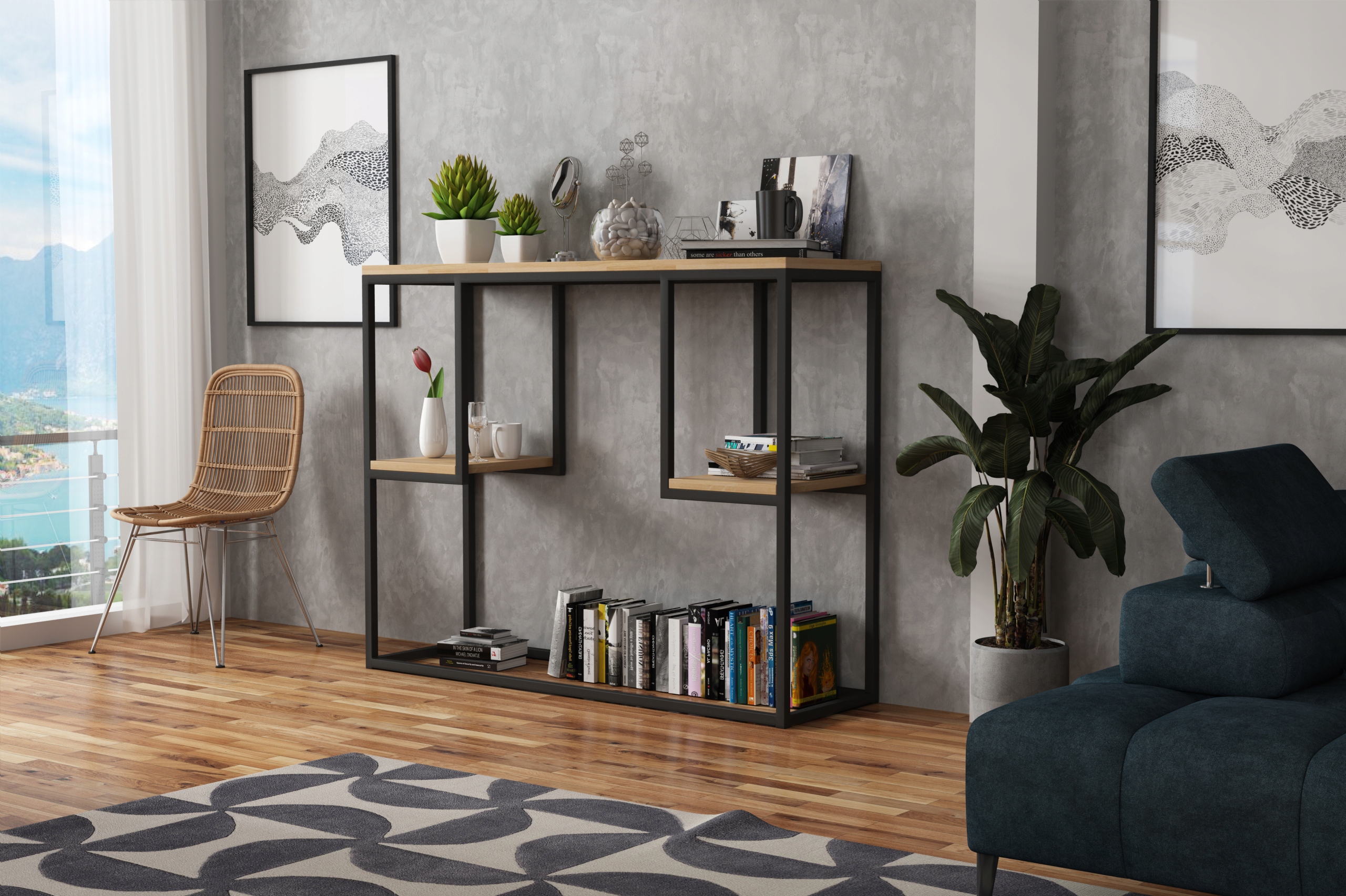 Элегантная индустриальная консоль с тремя деревянными полками.