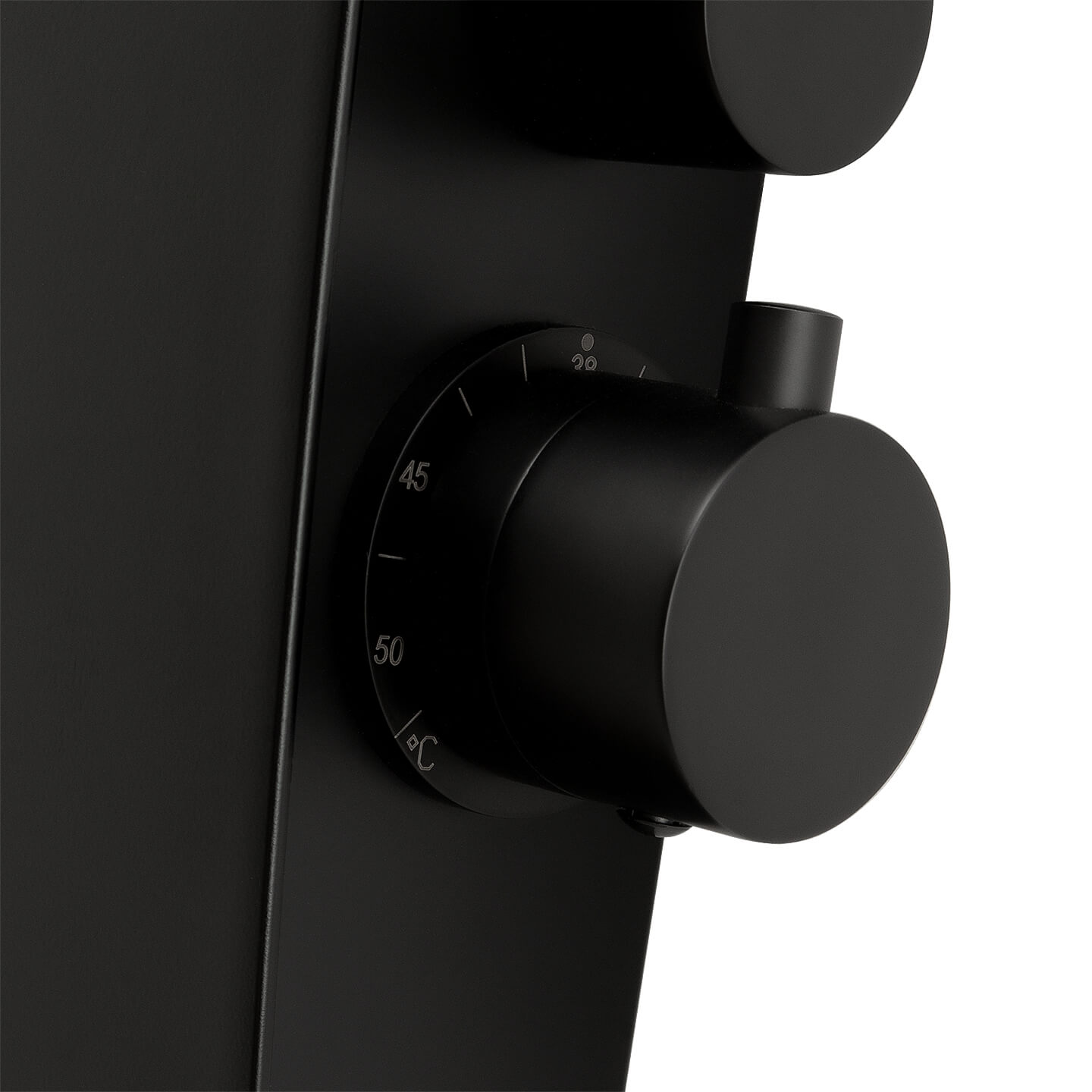 Панель также оснащена термостатической головкой Vernet. Такое решение не только облегчает пользование, но и защищает от случайных ожогов. Рядом с ручкой регулировки температуры имеется шкала с градусами Цельсия. После того, как температура установлена, при следующем использовании вы сможете включить воду только в выбранной функции.