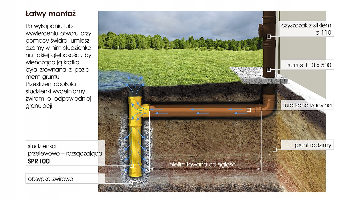 Кармат разработал простое и дешевое решение для сброса воды в систему ливневой канализации. Переливно-фильтрационный колодец отводит воду от построек даже на расстояние нескольких десятков метров, одновременно орошая заданную территорию. Большим удобством является возможность установить его в незаметном месте. Благодаря системе, обеспечивающей постоянное высыхание установки и предотвращающей ее замерзание, трубы можно располагать неглубоко ниже поверхности земли.