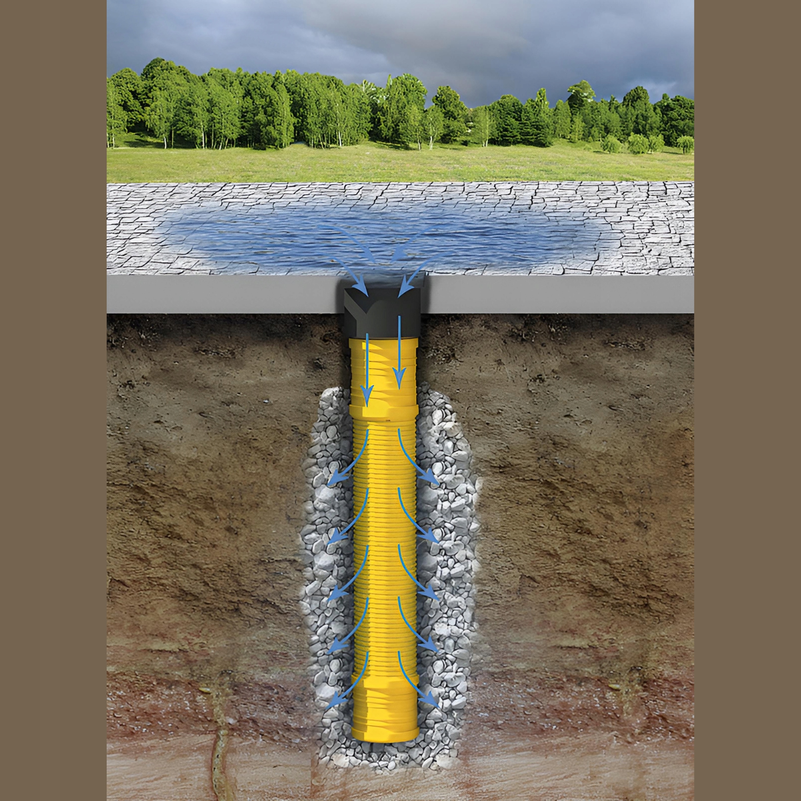 ✴️ Емкость для сбора воды: В дренажный колодец встроен резервуар, который используется для сбора лишней воды. Этот резервуар имеет цилиндрическую форму и может быть полностью или частично погружен в землю.