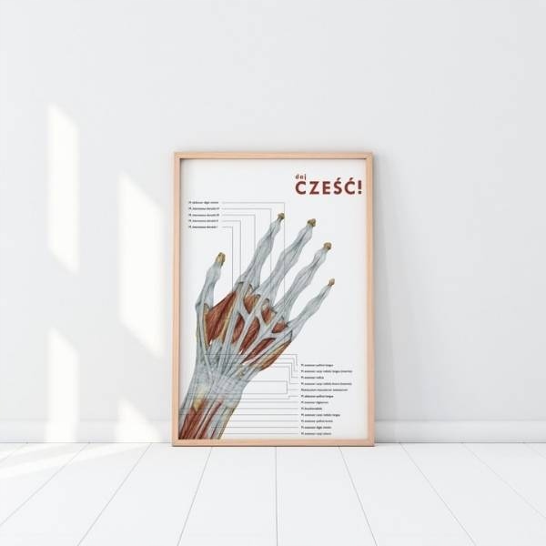 Анатомический плакат руки с надписью Give Hi — проект Марты Павелец, популярного среди врачей художника-графика. На доске изображена анатомия руки с тыльной стороны. Графика выдержана в современном и минималистском стиле, который подойдет к любому интерьеру, придав ему характер и более профессиональный вид. Плакат для офиса имеет размеры 50х70см, что соответствует универсальному формату B2. Элементы, составляющие анатомию руки, правильно подписаны в соответствии с латинской номенклатурой.