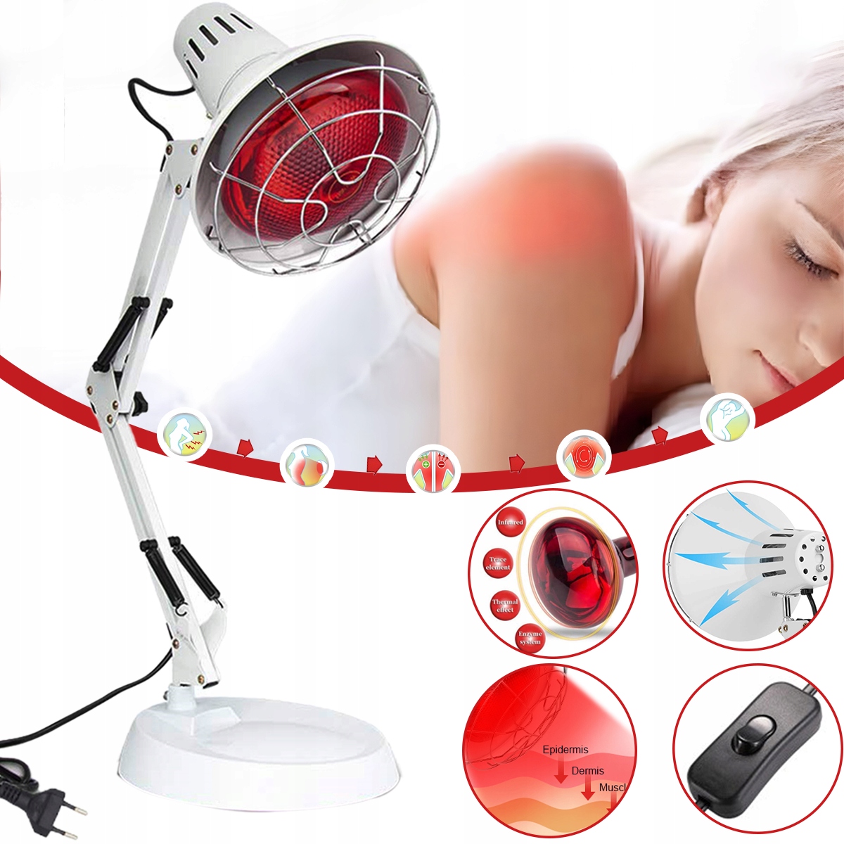 Облегчение боли: инфракрасные лучи, излучаемые красной нагревательной лампой для инфракрасения приличной кожи, вызывая тепловые эффекты и ускоряя кровообращение, что может способствовать расслаблению мышц и облегчить боль.