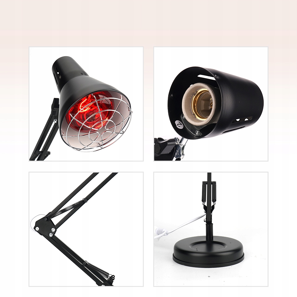 - Инфракрасная нагревательная лампа имеет стабильное и прочное основание с регулируемой шеей и головой.