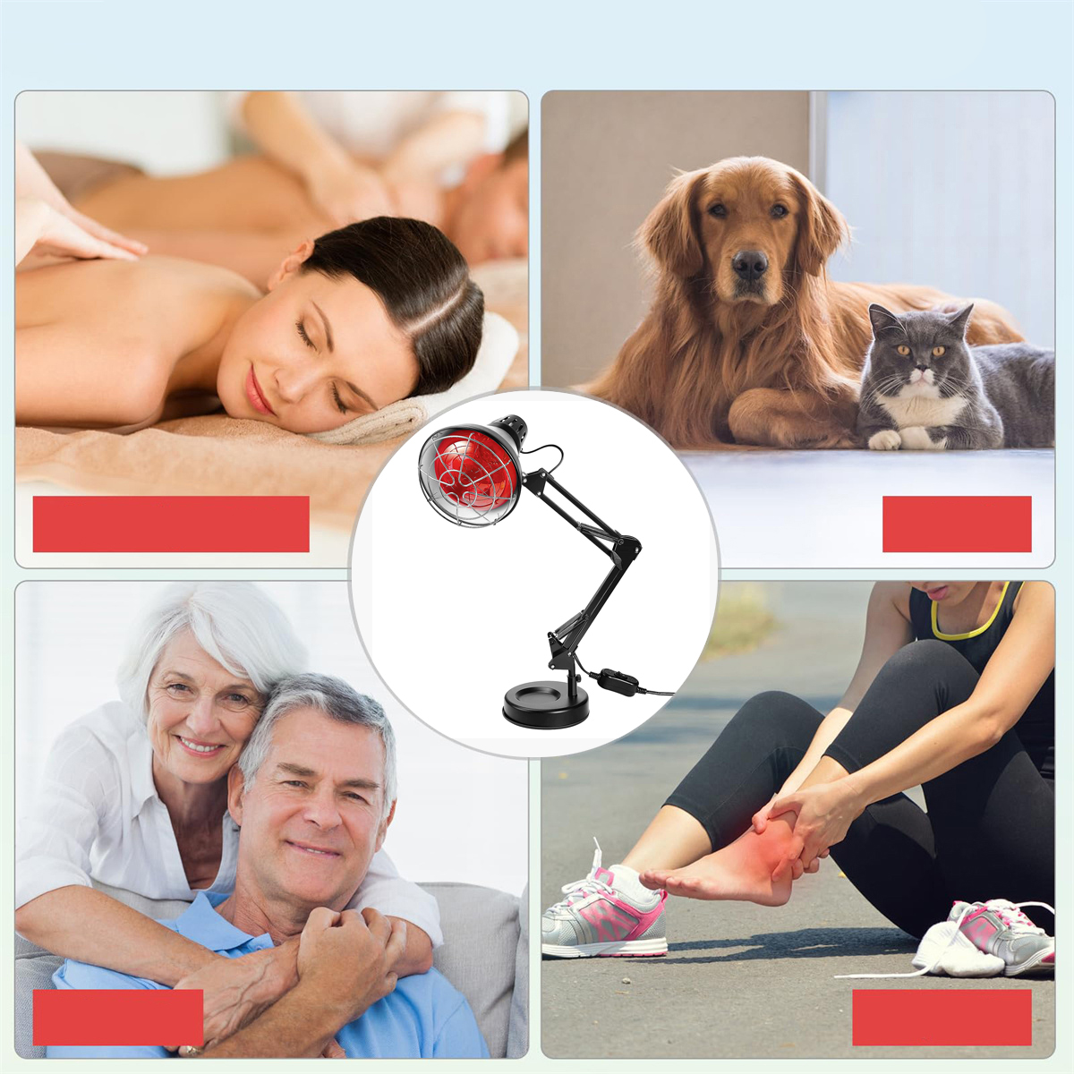 ФУНКЦИЯ: Естественная энергия этой нагревательной лампы идентична энергии, вырабатываемой в нашем организме. Он может улучшить микроциркуляцию и регулировать нервные и гормональные функции. Он стимулирует микроциркуляцию и обеспечивает организм высококачественным кислородом и питательными веществами. Устройство легко настроить для направления тепла туда, где это необходимо, и оно портативно. Успокаивание мышц: идеально подходит для снятия болей в мышцах и суставах, напряжения, заложенности бронхов и симптомов простуды.