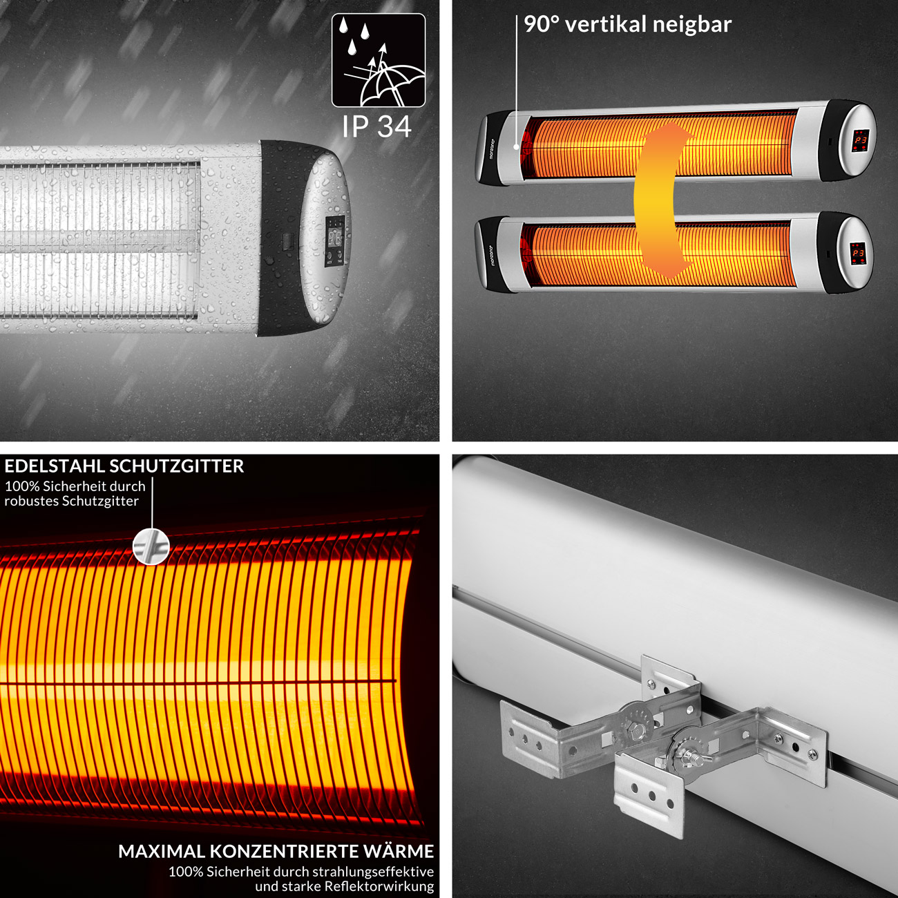 С помощью пульта дистанционного управления вы можете гибко выбирать между 3 уровнями нагрева и индивидуально контролировать тепловое излучение благодаря регулируемому углу наклона 90°.