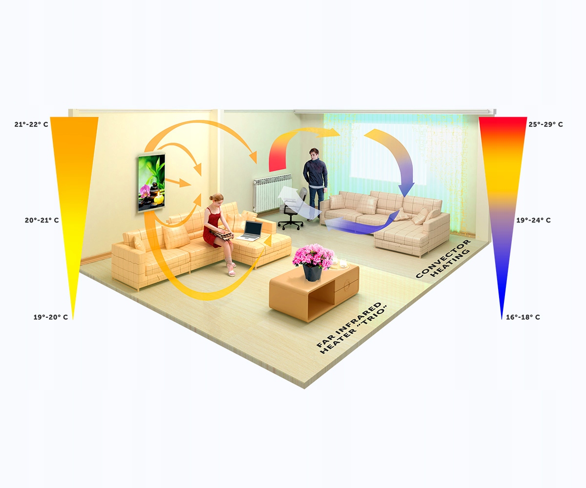 Это инфракрасный обогреватель (длинноволновой), он нагревает предметы в помещении, но не воздух. Это здоровое и комфортное отопление дома, благодаря которому мы экономим электроэнергию, а значит и деньги. Ощущение комфорта выше благодаря длинноволновой инфракрасной технологии при температуре 20°С, чем при использовании мощного конвектора при температуре до 25°С.