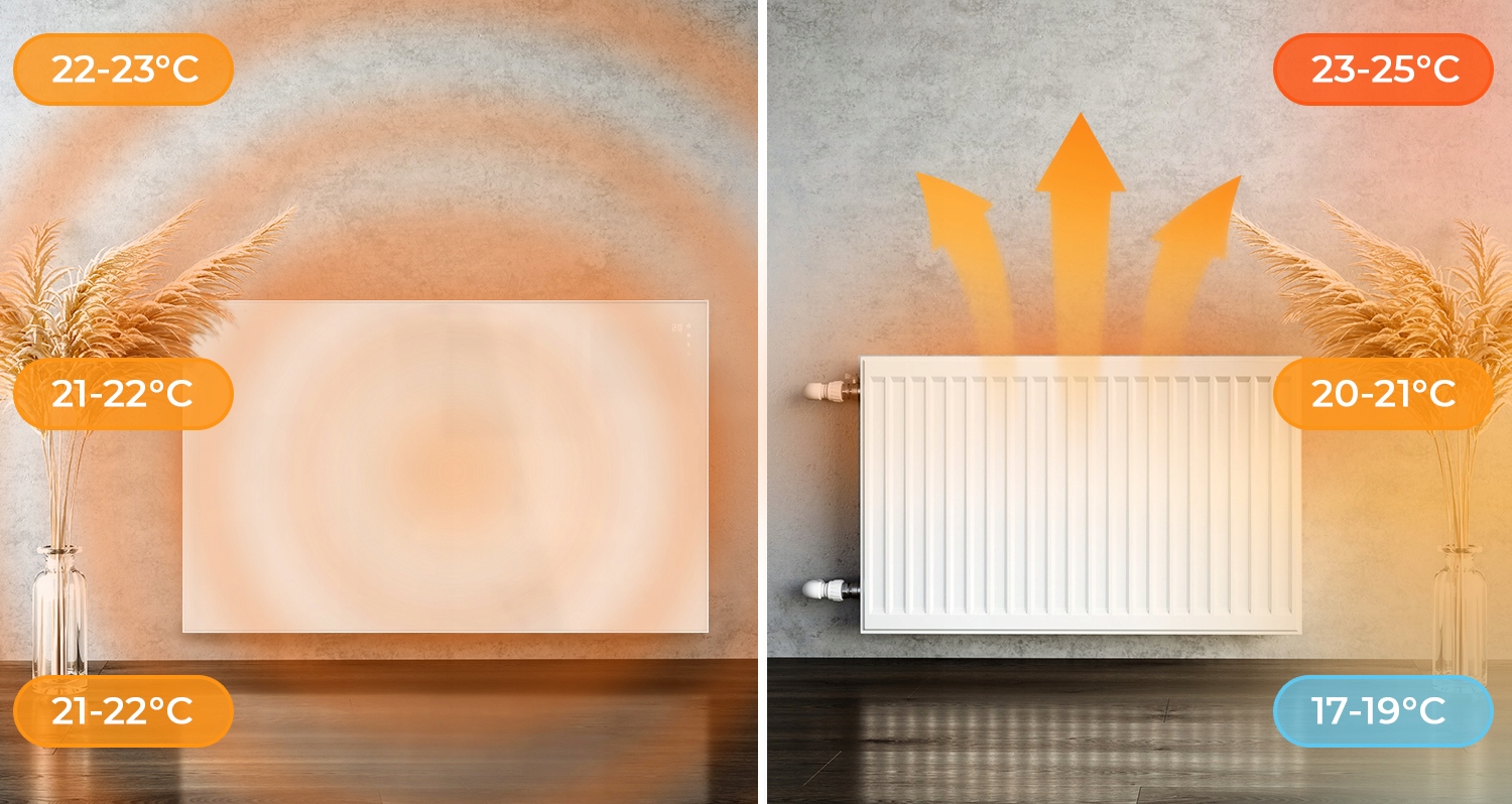 ✔️ Нагрев достигается за счет нагрева предметов, расположенных рядом с радиатором. Воздух не является теплоносителем.