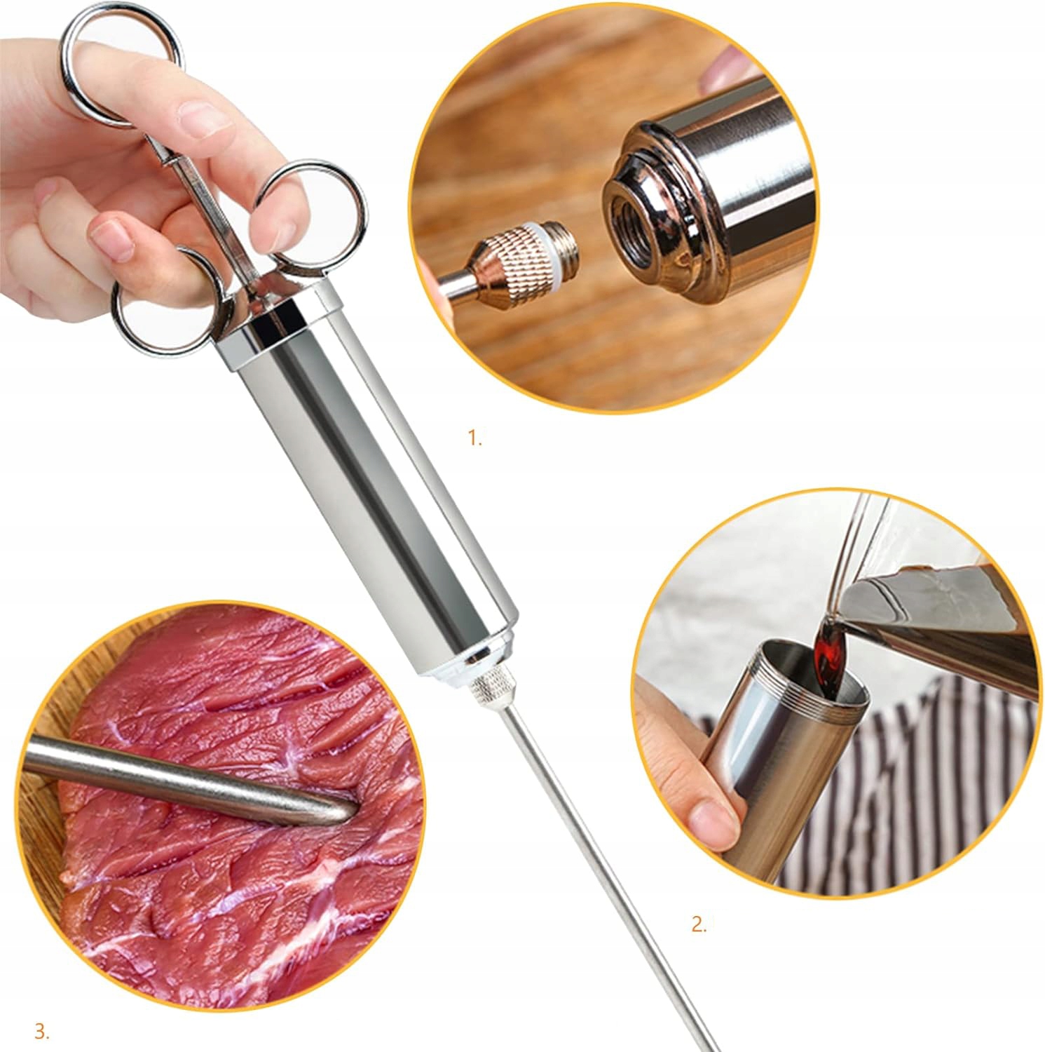 🍖【Что вы получаете】 Этот инжектор вкуса включает в себя 1 часть цилиндра инжектора маринада на 2 унции; 3 штуки профессиональных игл для мяса; 2 кусочка кисти; 4 запасных силиконовых уплотнительных кольца для шприца.
