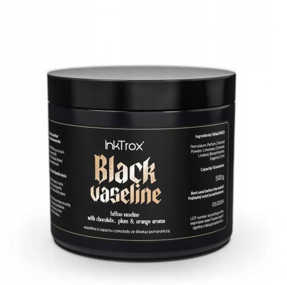 Это фантастический продукт с ароматом шоколада, сливы и апельсина, который идеально подходит как татуировщикам, так и владельцам татуировок. InkTrox Black Vaseline – это, прежде всего, очень безопасное и универсальное вещество, в состав которого входит, среди прочего, активированный уголь. Оказывает очищающее и противовоспалительное действие. Этот вазелин подходит для всех типов кожи, не вызывает аллергии и раздражений. Он не только прекрасно переносится, но и обладает защитными свойствами. Он увлажняет и смазывает кожу, обеспечивая ей необходимую смазку и тем самым защищая ее от всех раздражений, которые могут возникнуть во время процедуры татуировки. Более того, вазелин предотвращает размазывание чернил во время нанесения татуировки, улучшая прозрачность во время работы. Более того, для нанесения татуажа определенно лучше подходит хорошо увлажненная кожа. InkTrox Black Vaseline благодаря своей вязкости также идеально подходит для подготовки рабочего места татуировщика перед процедурой. Это облегчает крепление стаканчиков с краской к станции, чтобы они не смещались и не проливались. Дополнительным преимуществом этого продукта является аромат шоколада, сливы и апельсина, а также черный цвет, что делает этот вазелин уникальным и выделяет его среди других продуктов. На это обязательно обратит внимание каждый клиент тату-студии. Однако, если вы подумываете о покупке вазелина для ухода, это отличная идея. InkTrox Black Vaseline идеально подходит для ухода за хорошим состоянием кожи и ногтей.