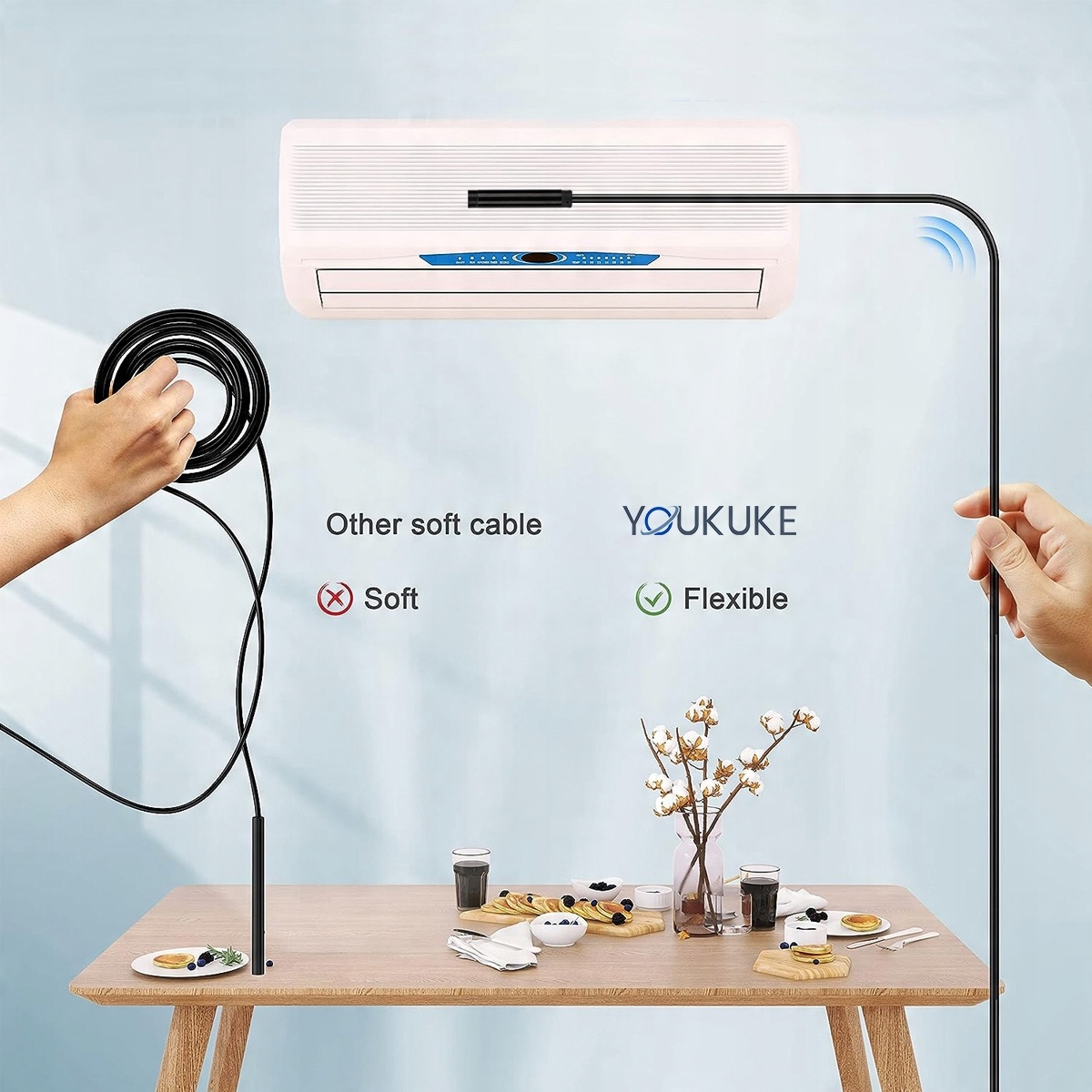 Шланговая камера может свободно сгибаться и остается полужесткой. жесткий. Полужесткий кабель длиной 5 м можно быстро разматывать и втягивать, обеспечивая хорошее сочетание гибкости и жесткости. Благодаря водонепроницаемости IP67 часть камеры может работать под водой на глубине до 1 м в течение часа.