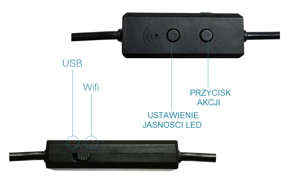 <р>1. Магнитный наконечник <р>2. Конец крючка <р>3. Совет с зеркалом <р>4. Водонепроницаемый наконечник (с уплотнением).Устройство генерирует собственную сеть WIFI, к которой мы подключаемся с помощью нашего смартфона/iPad.