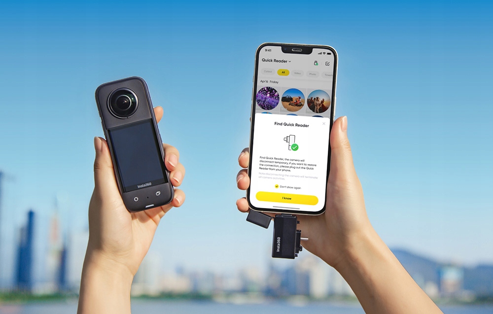Наслаждайтесь быстрой передачей файлов без подключения через Wi-Fi. Созданная для Insta360 X3, программа Quick Reader может выступать в качестве внешней памяти камеры — просто вставьте карту microSD (не входит в комплект). Таким образом, вы можете быть уверены, что вам не хватит места для ваших видео! Закончив запись, подключите аксессуар к телефону и с легкостью скопируйте выбранные материалы. Камеру не обязательно включать, что позволит сэкономить заряд аккумулятора. Quick Reader поддерживает Plug&Play и обеспечивает быстрое и стабильное соединение. Более того, он оснащен 2-мя разъемами — USB-C и Lightning, а значит, совместим с устройствами Android и iOS. Теперь загружать и редактировать материалы станет еще проще!