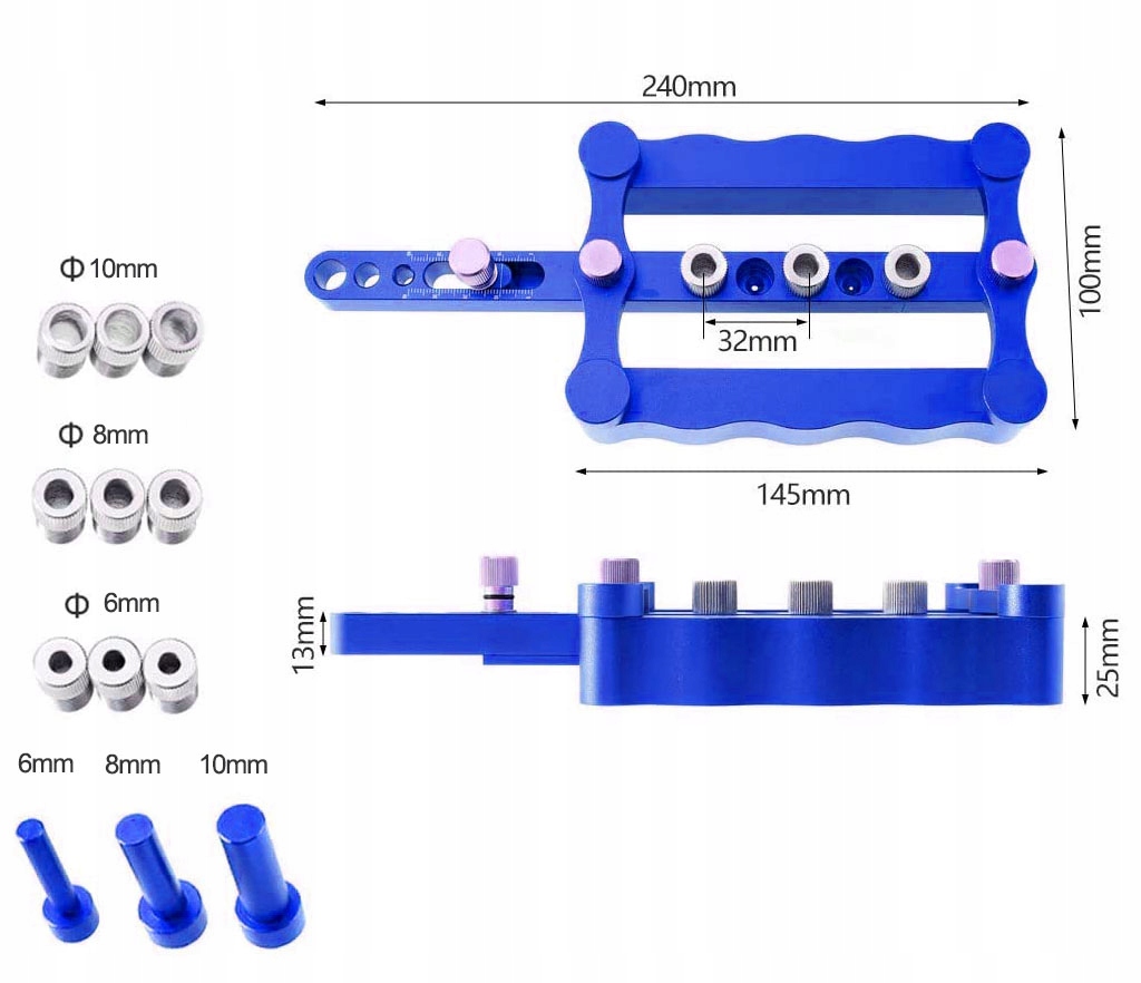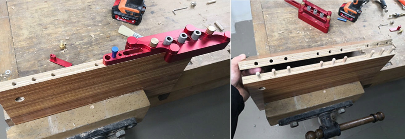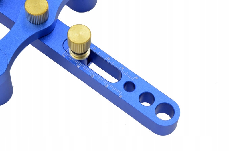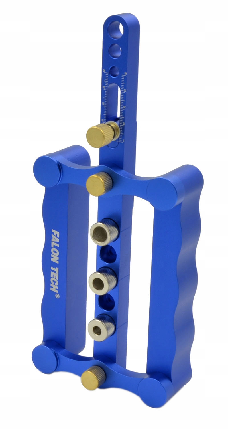 Универсальное устройство для разметки мест для изготовления отверстий под дюбеля для соединения деревянных элементов, например мебельных щитов. Указывает центр кромки досок шириной 17 – 50 мм. Конструкция шаблона позволяет делать отверстия также на плоскости, а не только по краям. Изготовлены из сплава на основе алюминия, ввинченные в корпус стопорные втулки диаметром 6, 8, 10 мм изготовлены из закаленной стали. Простое, эффективное и точное устройство для профессионального использования и требовательных любителей DIY.