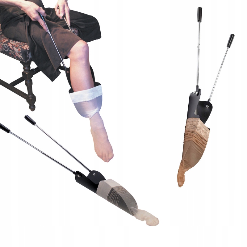Телескопические регулируемые ручки длиной от 38 до 60 см позволяют надевать носки или колготки на одну и ту же ногу. Выполнение повседневных дел, таких как одевание, может быть чрезвычайно трудным для многих людей с ограниченными возможностями и пожилых людей. Для таких людей было создано простое в использовании приспособление для надевания носков.